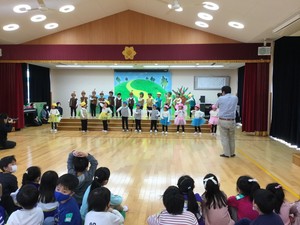 今年の発表会の劇は、この2つのお話をしようということになりました。みんな自分の役になりきり、台詞や振り付けを覚え、練習の時には、いきいきと演じていました。ばら、もも組みんなで一つのことを作り上げていく楽しさや経験は、必ず今後の大きな成長につながっていきます。本番では、今までで一番最高の演技をお家の方たちに見てもらうことができました。