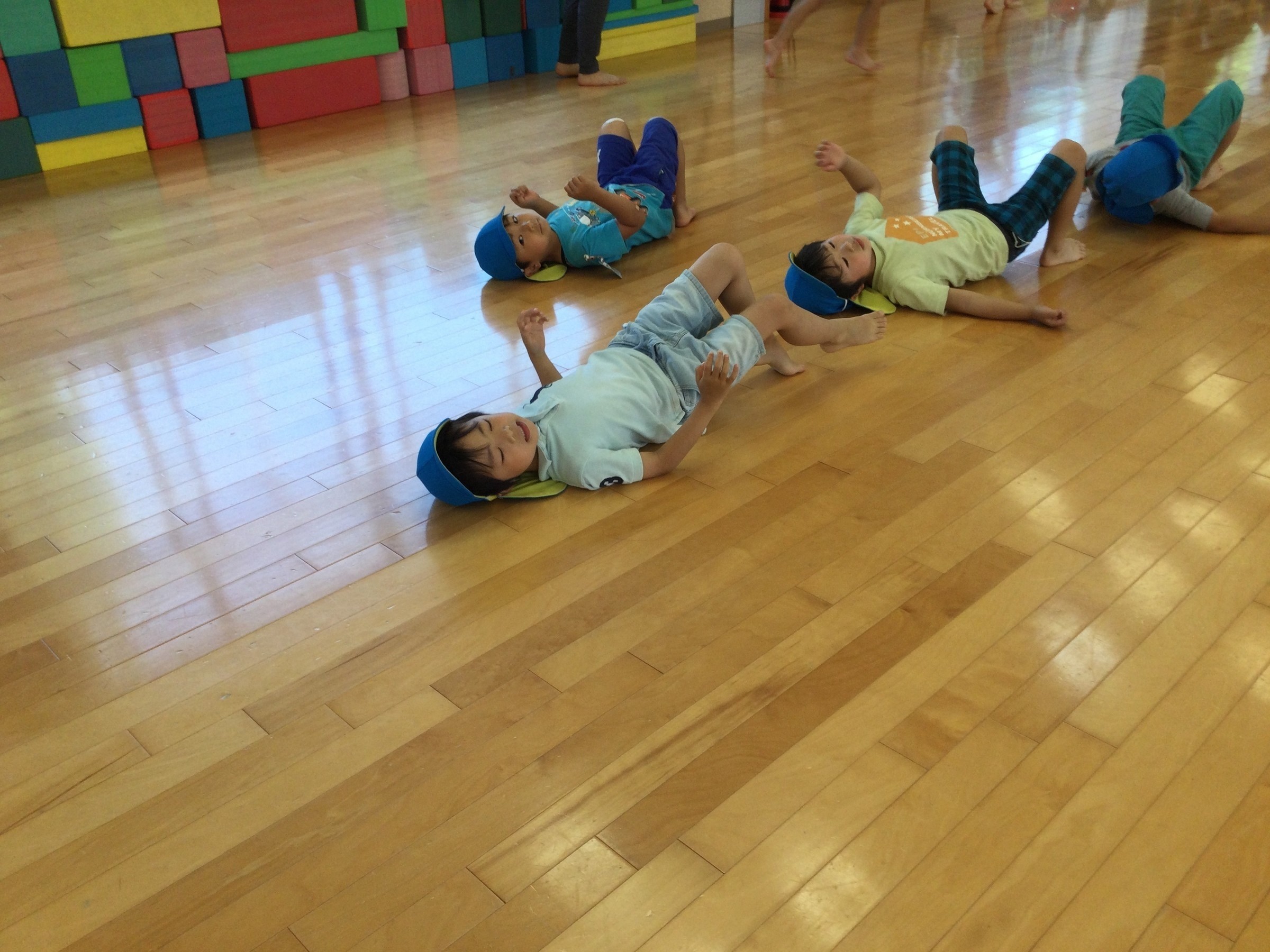 今日はみんなで運動遊びをしました。 今回新たな運動あそびは、まずは「ミミズ動き」 背中をつけて、足の力だけで頭の方へ進んでいきます。 足の力がかなり必要になりますし、体のバランス力も大切です。