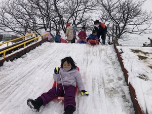 今日は柔らかい雪がたくさん降り積もり、ゆき・すみれのみんなは大喜び!雪合戦やかまくら作り、ソリ遊びで楽しみました。「交代してあげるよ」「次のひとー」と声を掛け合いながらソリをしたり、「4人で入れるかまくらにしよう」と同じ目的を共有しながら力を合わせる場面が見られたりと、充実感をもってやり遂げようとする姿が印象的でした。