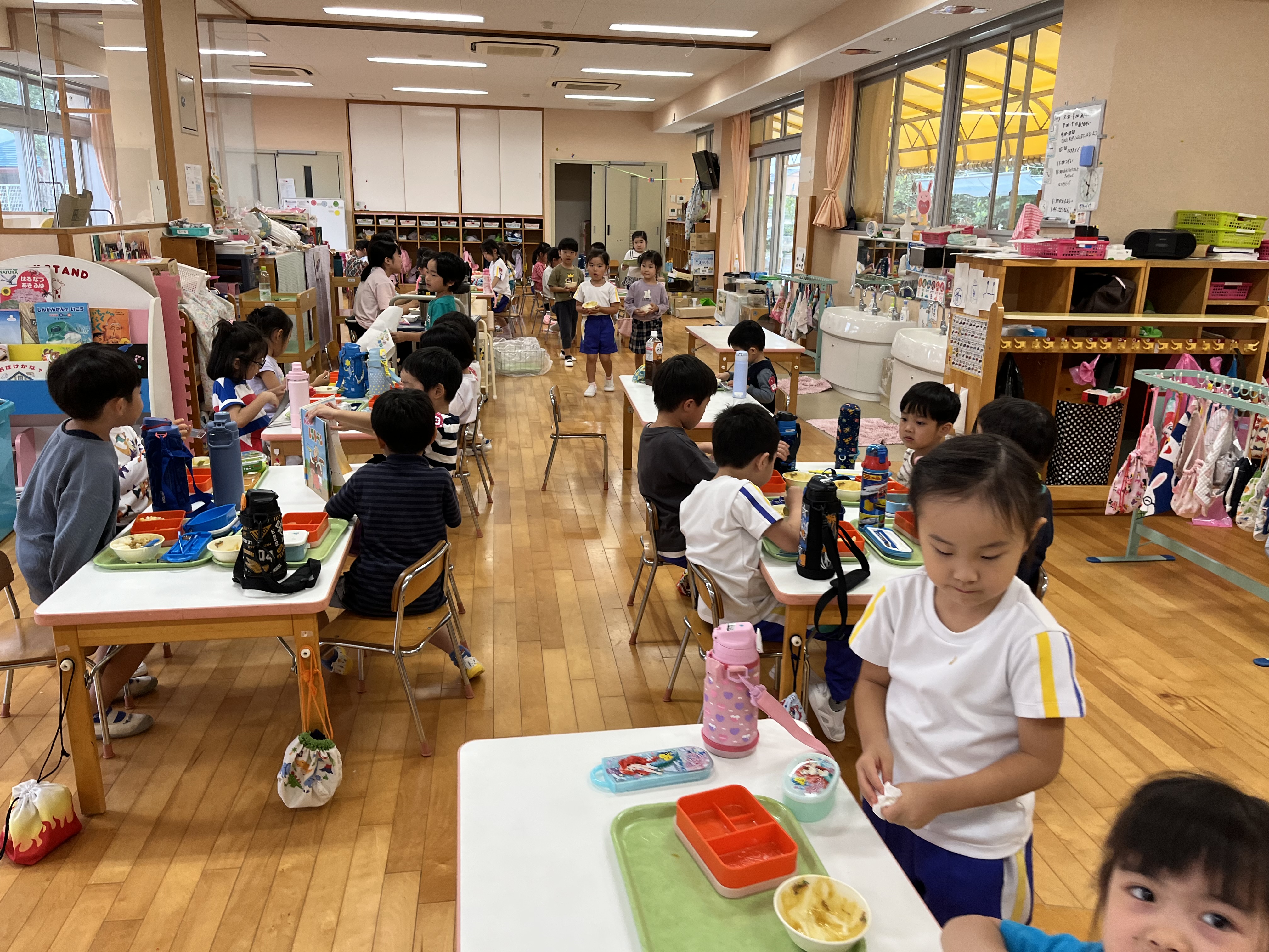 年中児が年長保育室に入ってくると、「一緒にたべよ!」と手をつなぐ子供たち。