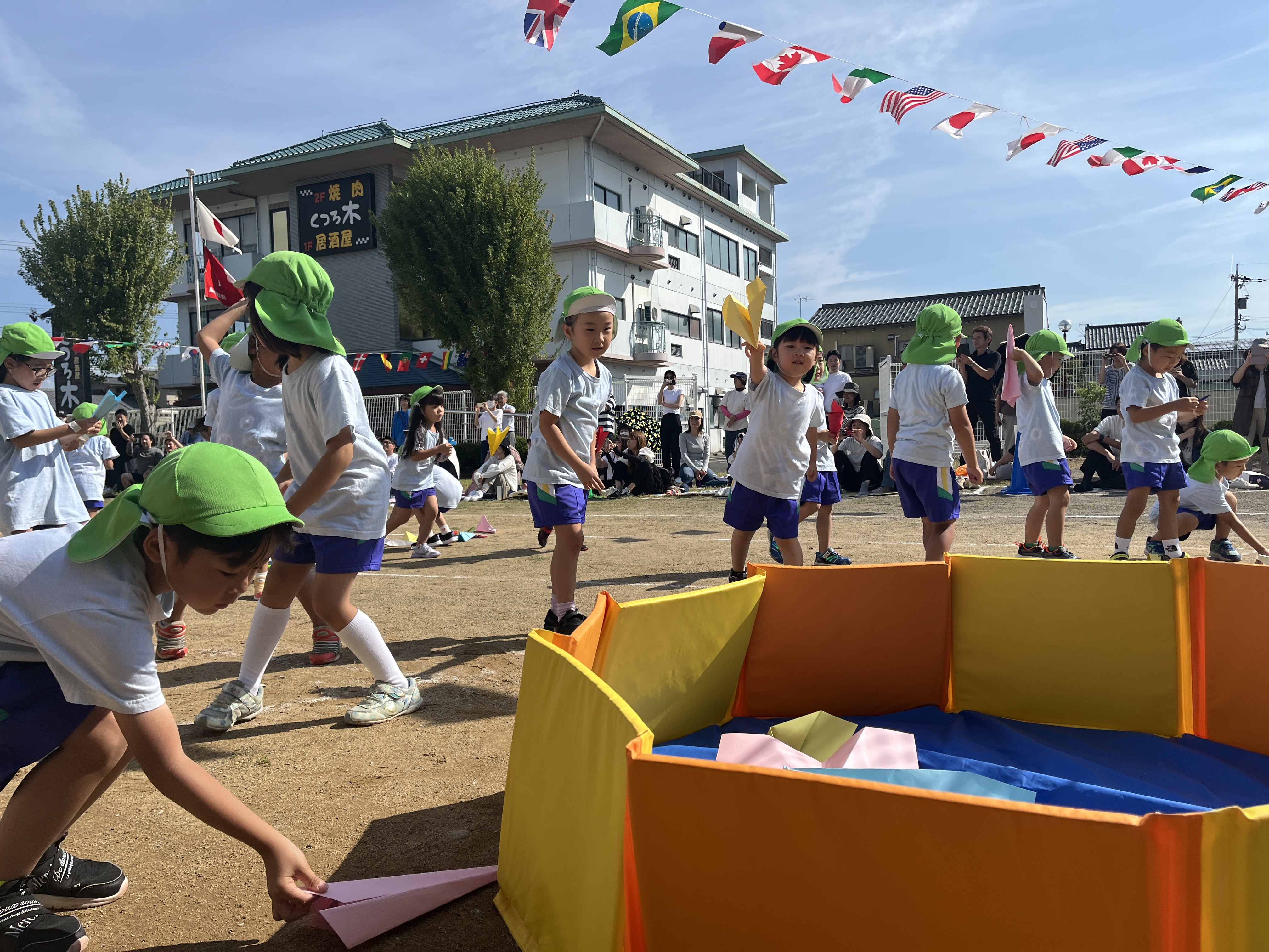 子供たちと相談し、紙飛行機を飛行場に見立てたマットやかごに入れる”紙飛行機飛ばし”