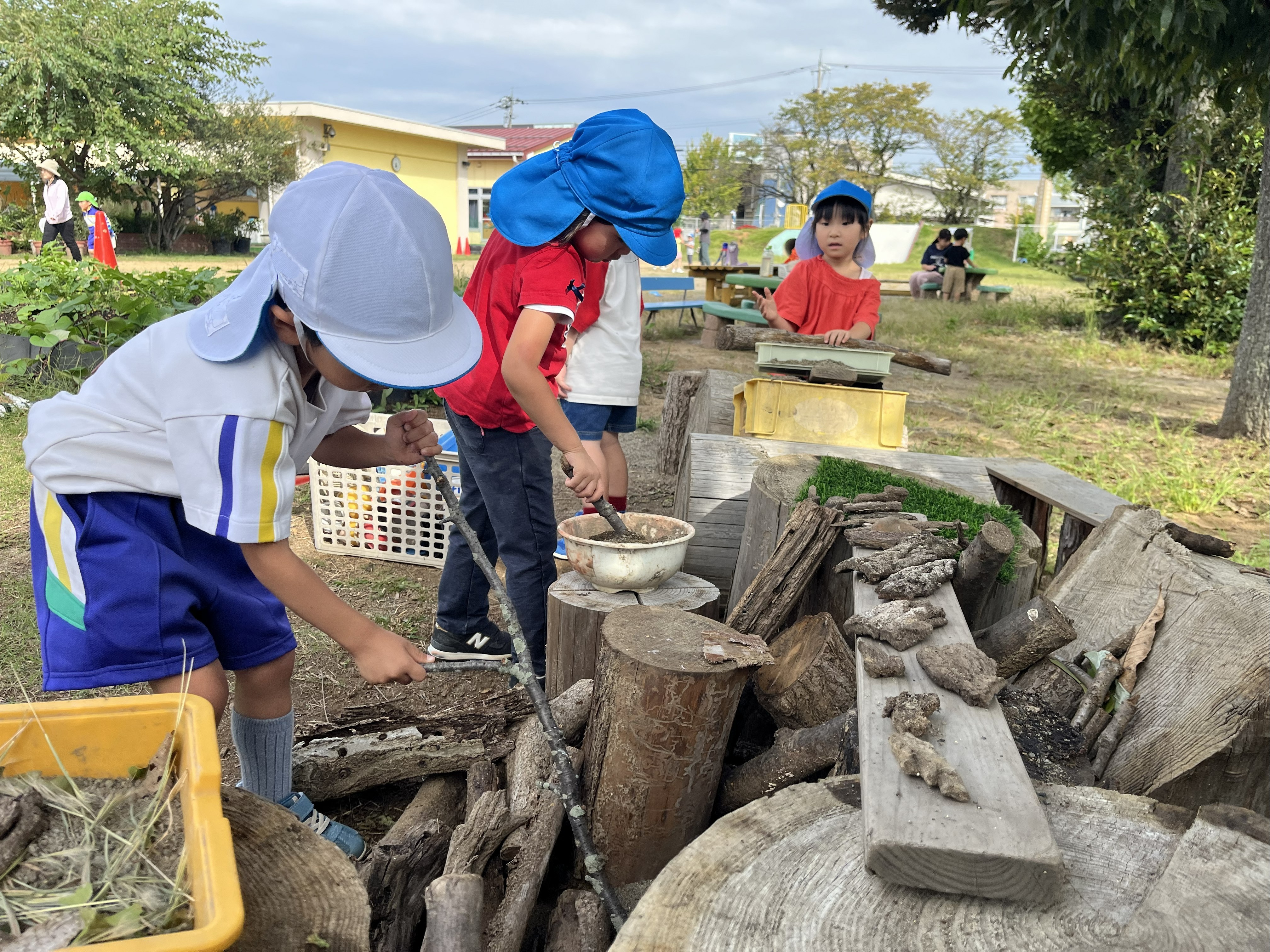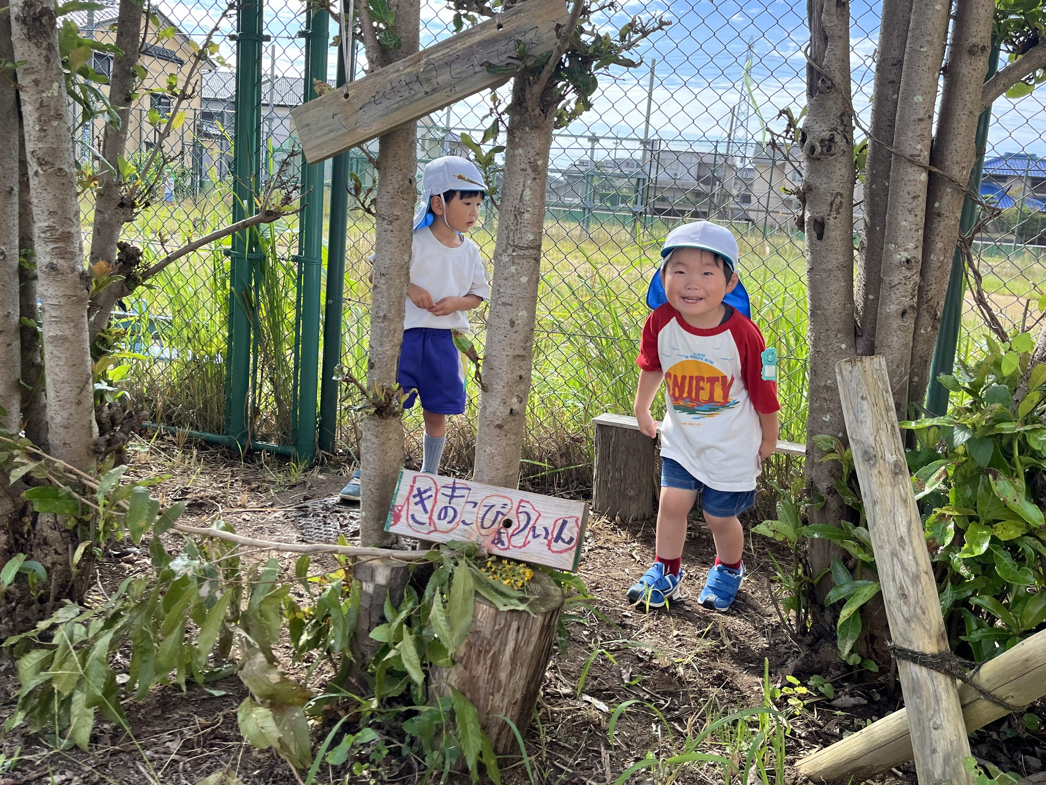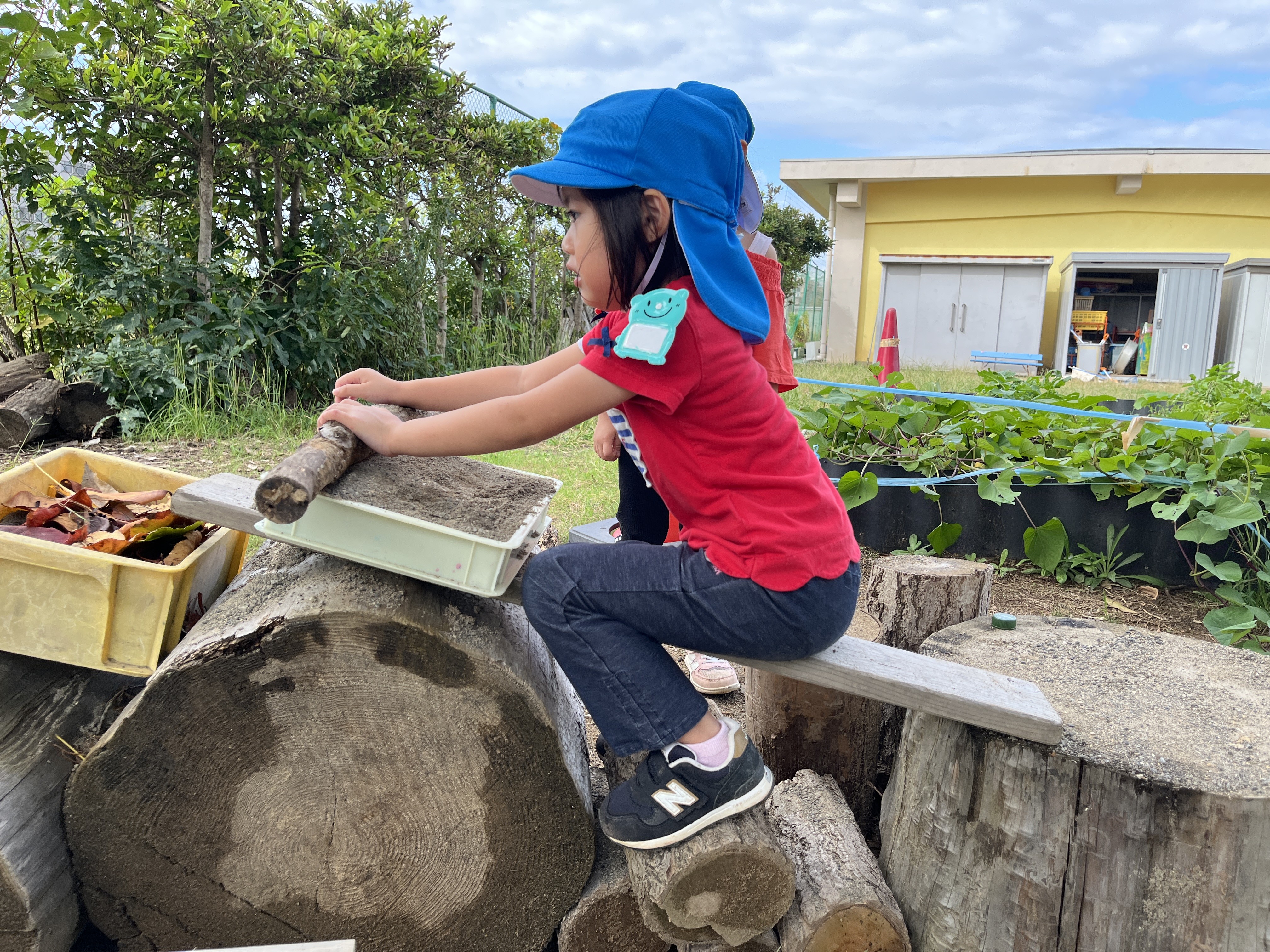 「虫のお家」が賑やかになると、そこの主要メンバーだった子たちはスーッと離れ、また別の場所に心地いい場を見つけました。そこは、きのこの原木があった植木の陰。その場は「きのこ病院」と名付けられ、そこでもまた見立て遊びが膨らんでいます。