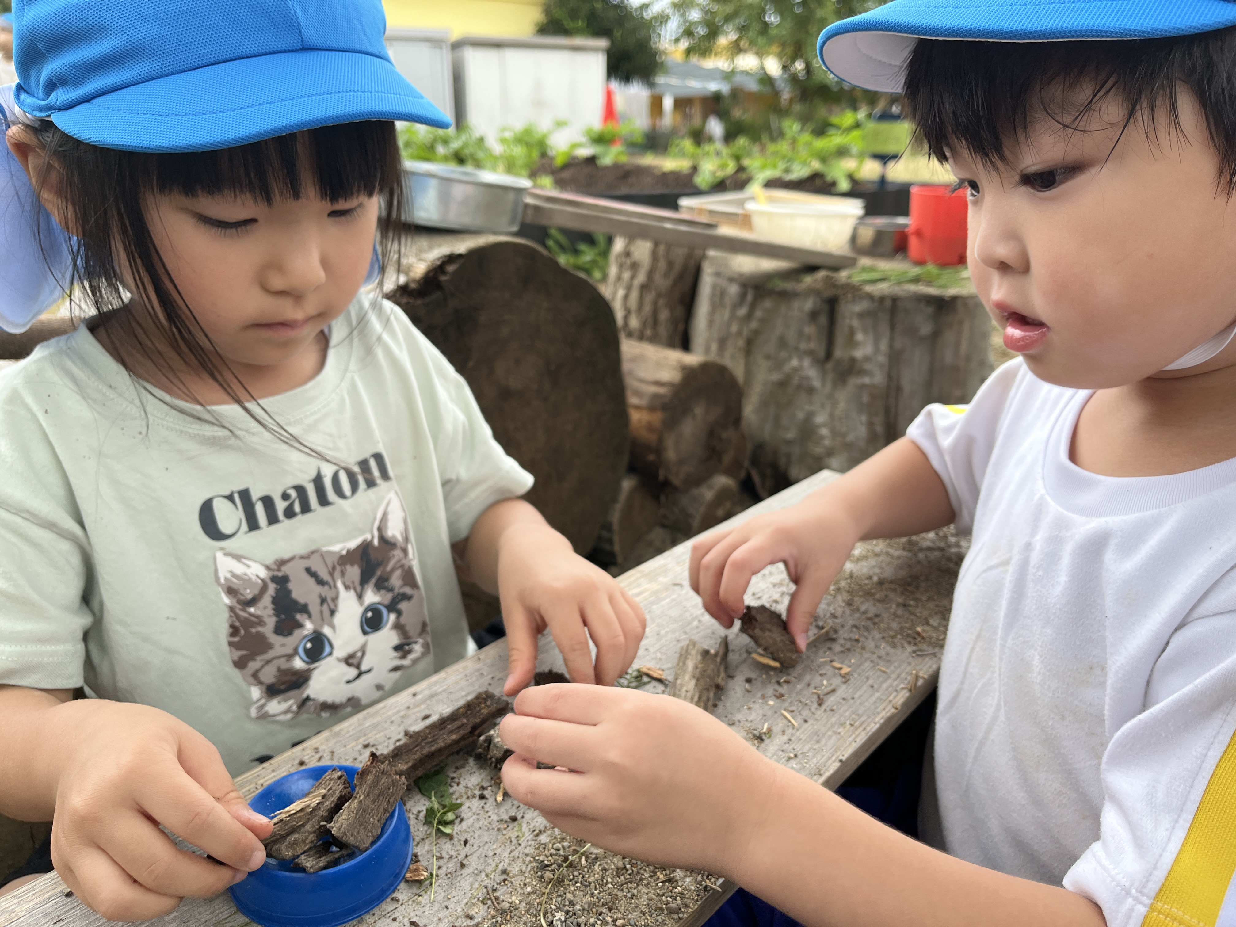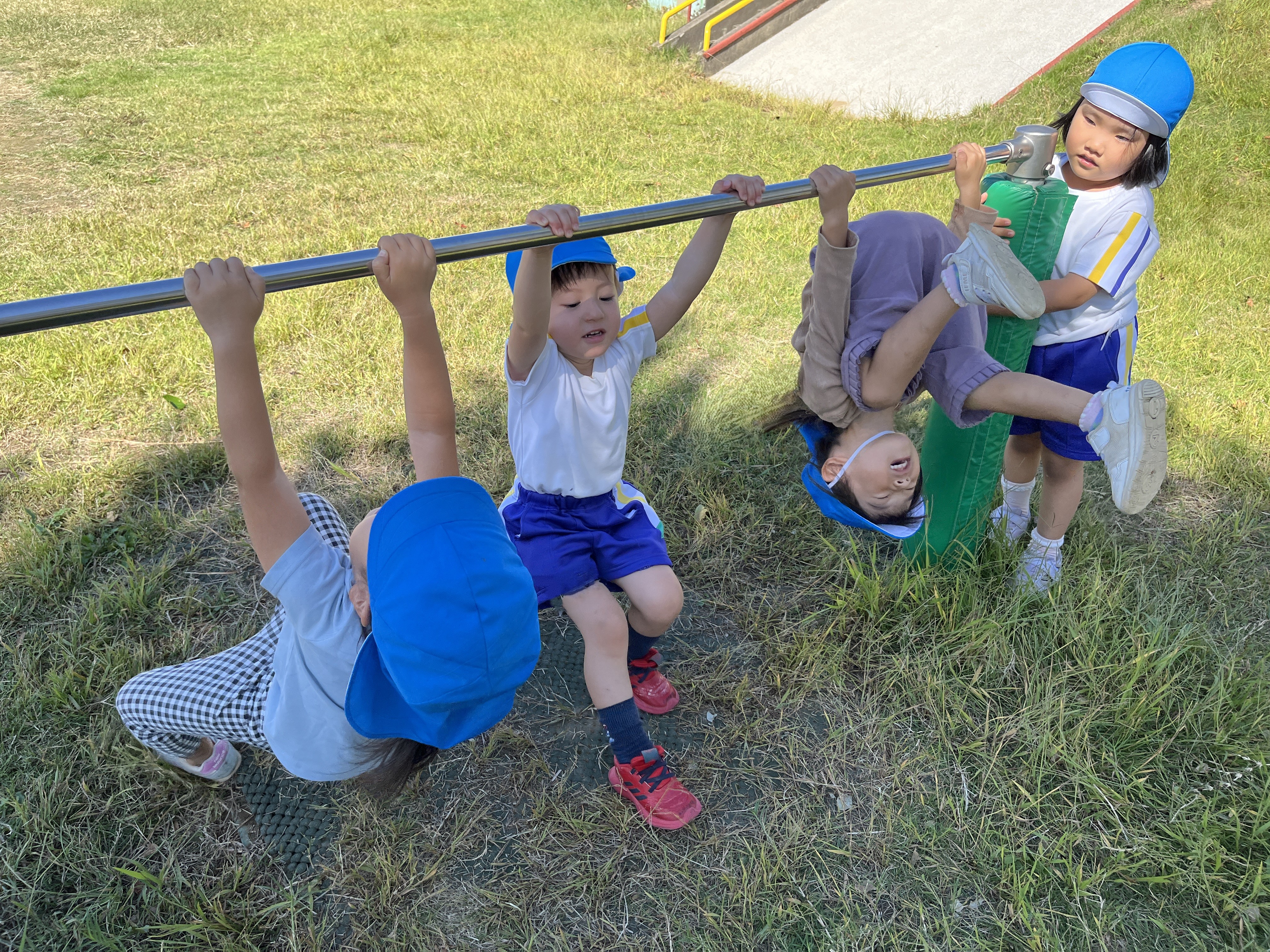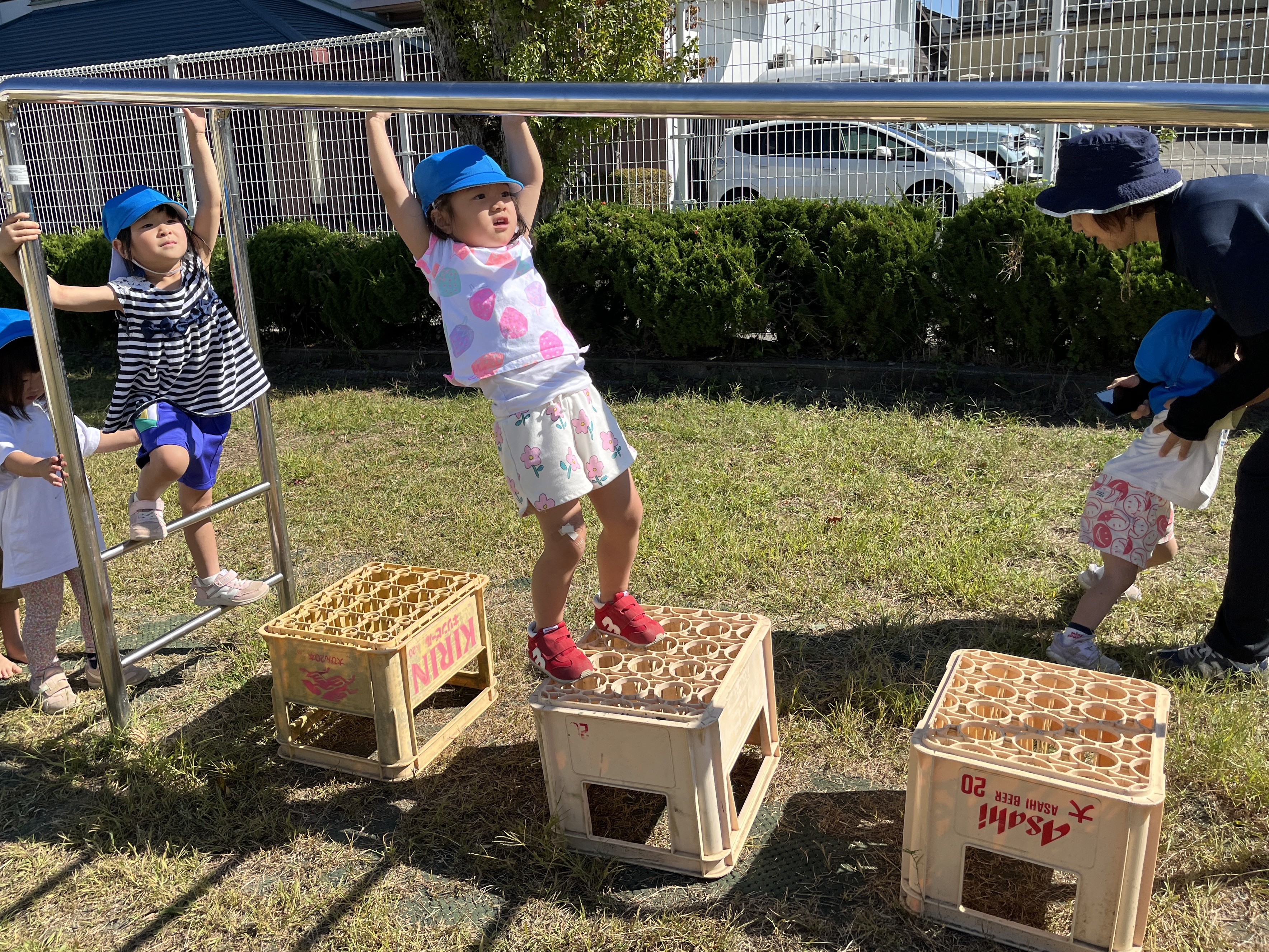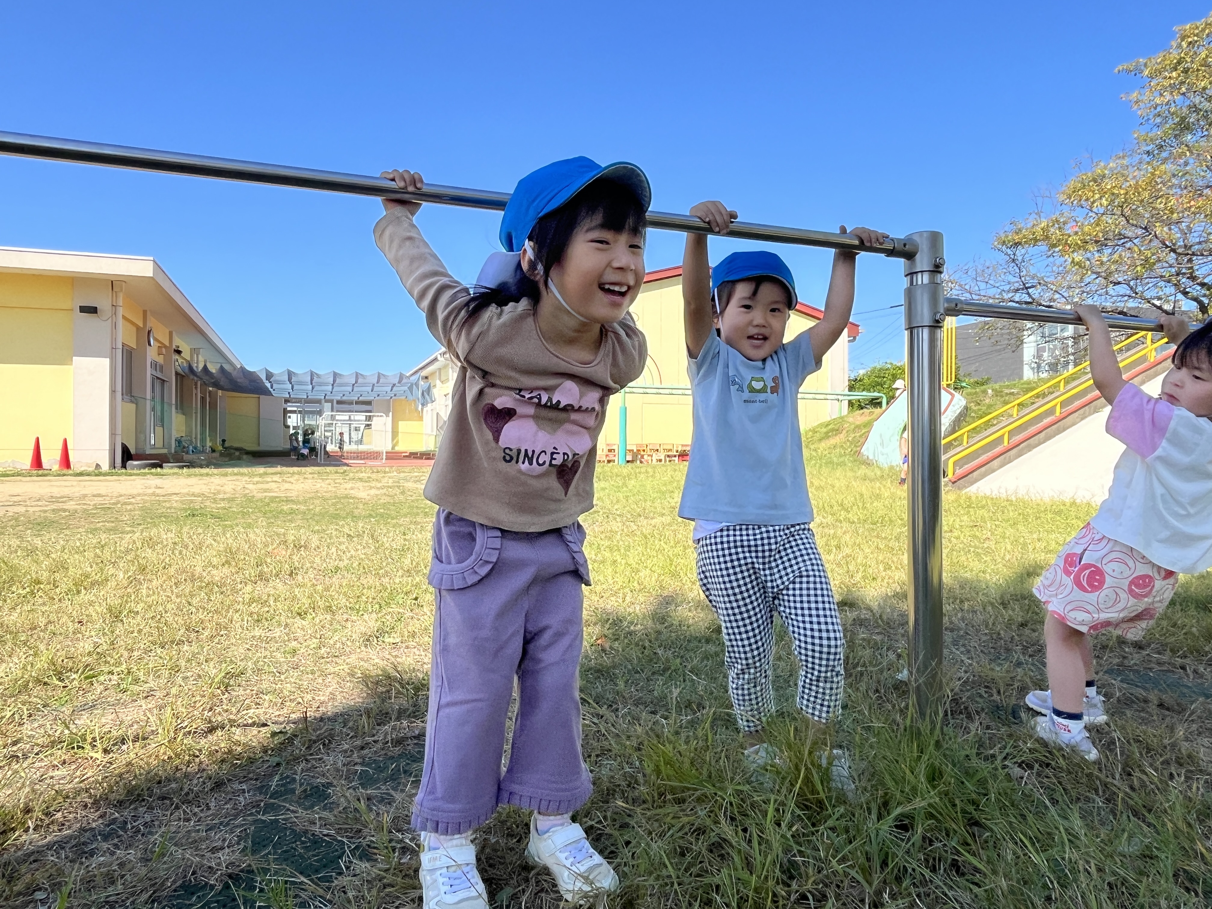 天気のよい日には、外で「虫のお家」や「きのこ病院」で遊んでいます。最近では、鉄棒やうんていなどの運動遊びを楽しむ姿もちらほら。冬が来る前に、体を十分に動かして楽しみたいと思ってます。