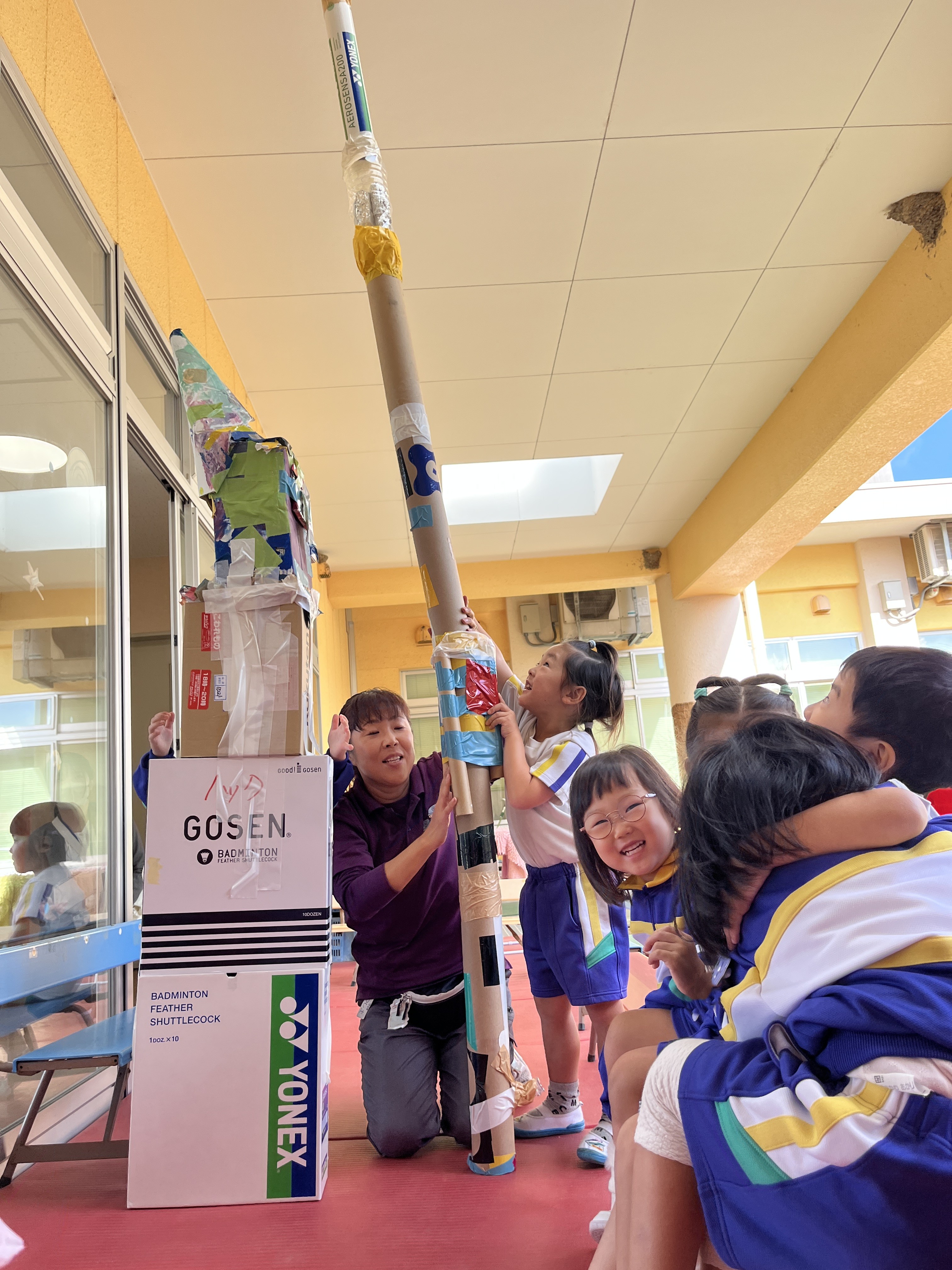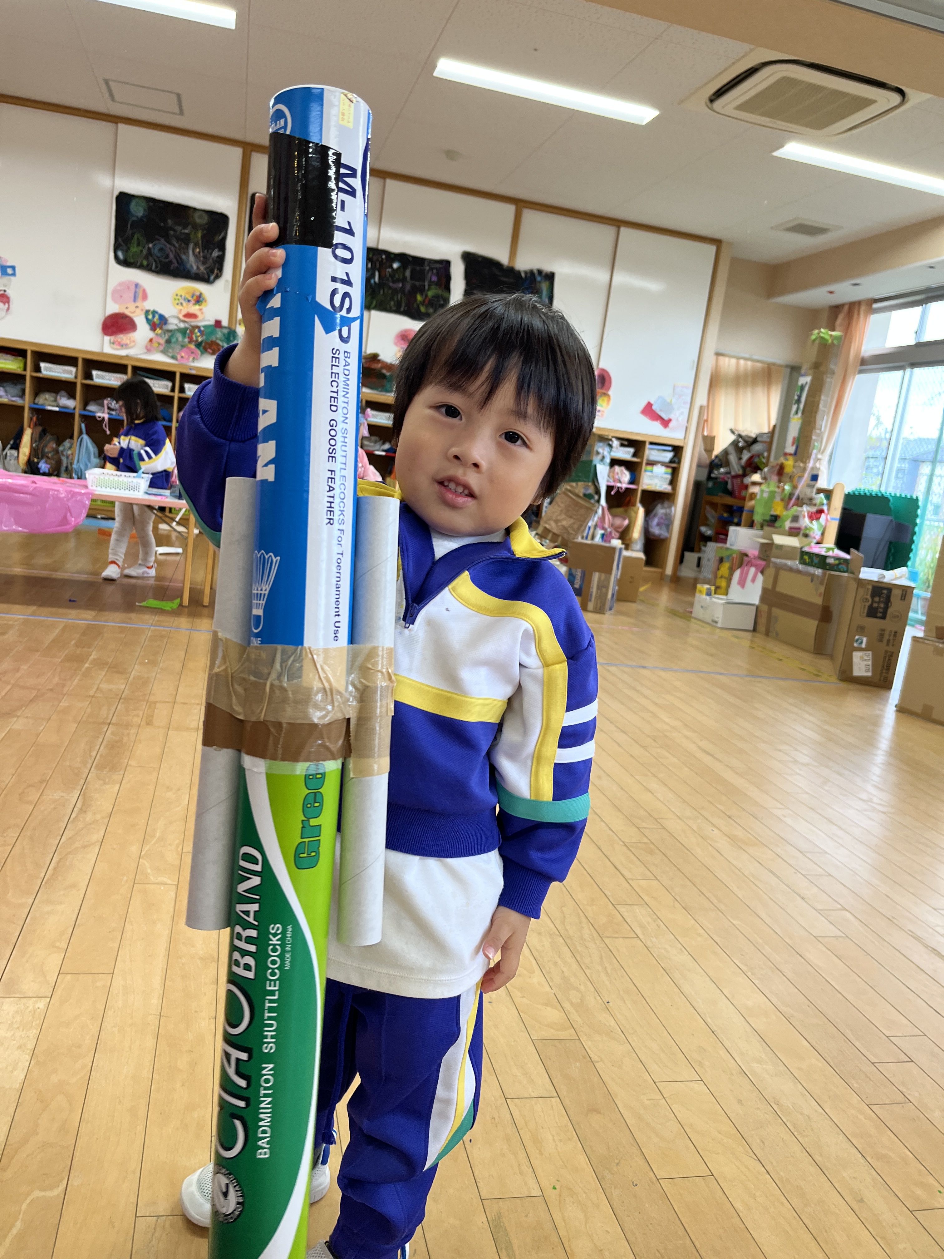 年少室では、大きなロケットを作り出す子が現れました。大きな筒をつなぎ合わせたり、エンジンをつけたりと盛り上がっています。10月26日(日)に種子島宇宙センターから、ロケットが打ち上げられたばかり。それを見た子の「ロケットが作りたい!」の一言がきっかけでロケット遊びが始まりました。今後、どのように展開していくのか、これから楽しみです。