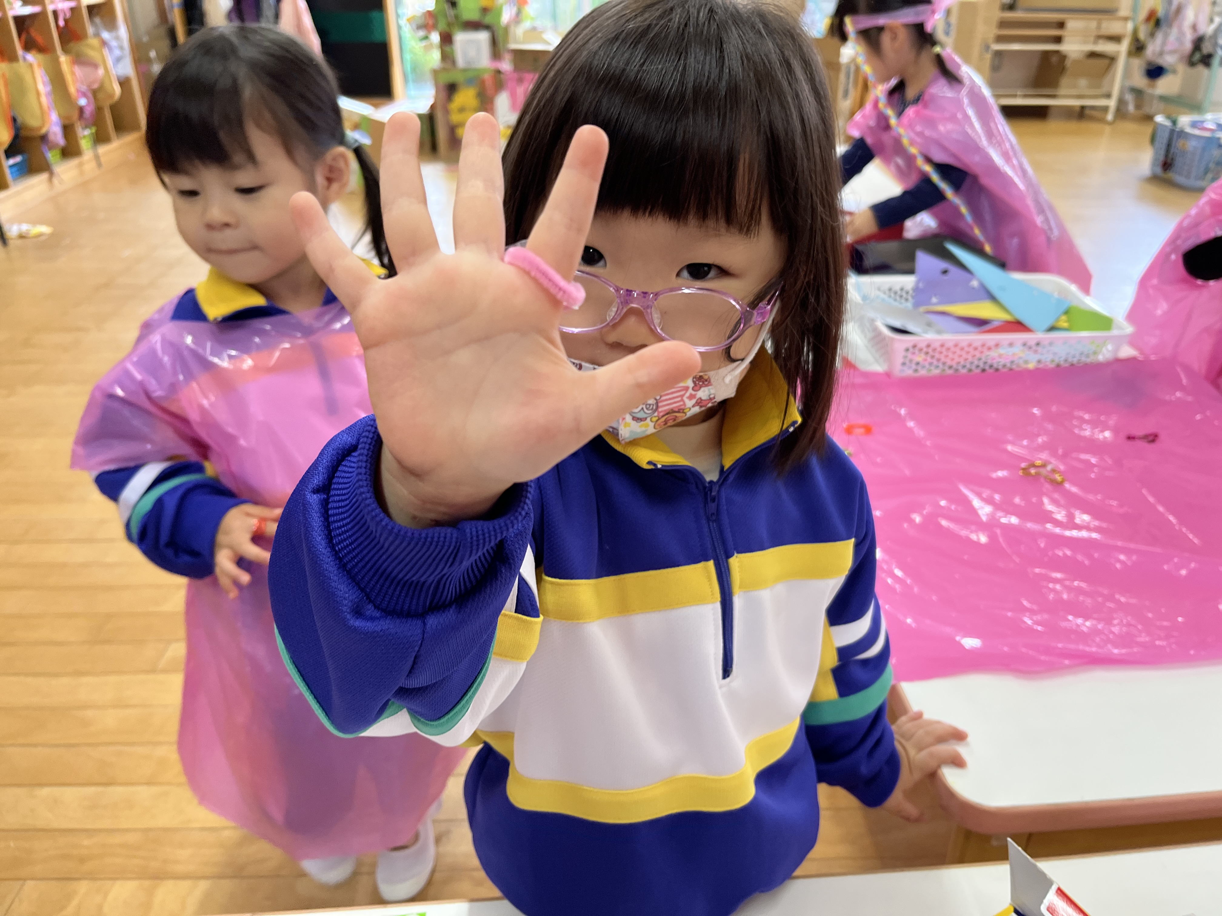 部屋の反対側では、ドレス作りからアクセサリー作りへと遊びが広がっています。プリンセスになりたい女の子たちが、ドレスを着ながら指輪やネックレスなどのアクセサリーを作って楽しんでいました。友達が作るのを見て、新しく作りたくなった子もいたようで、作り方を教えてあげる姿も見られました。イメージを共有しながら、自分のオリジナリティも忘れない!豊かな想像力と創造性に驚かされています。