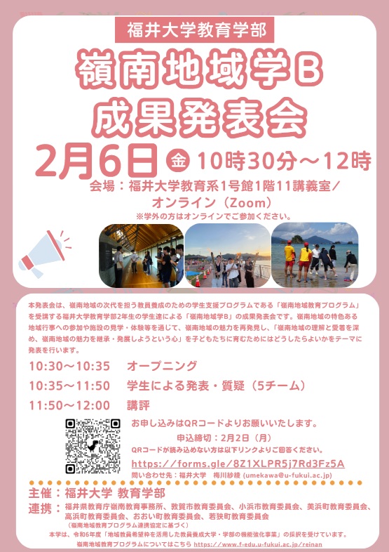 福井大学教育学部2年生による「嶺南地域学B」成果発表会をオンラインにて開催します。