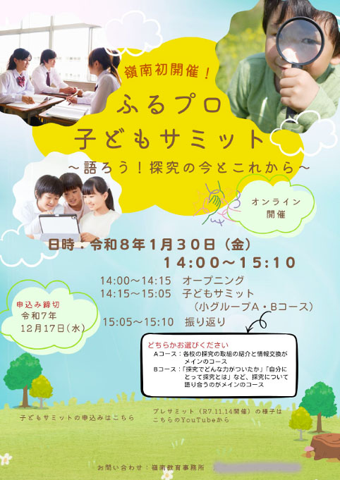 「子どもサミット」は、嶺南教育事務所が中心となって行なっている「嶺南ふるさと学習推進プロジェクト(ふるプロ)」の取組の一つとして、令和7年度に初めて実施されたものです。参加した嶺南地域の小中高校生は、11グループに分かれ、各校の探究的な学びについて実践交流したり、探究的な学習の意義等について語り合ったりしました。主催者からは、「プログラム学生は、児童・生徒の交流の活性化に大きな役割を果たしてくれた」との評価を頂きました。