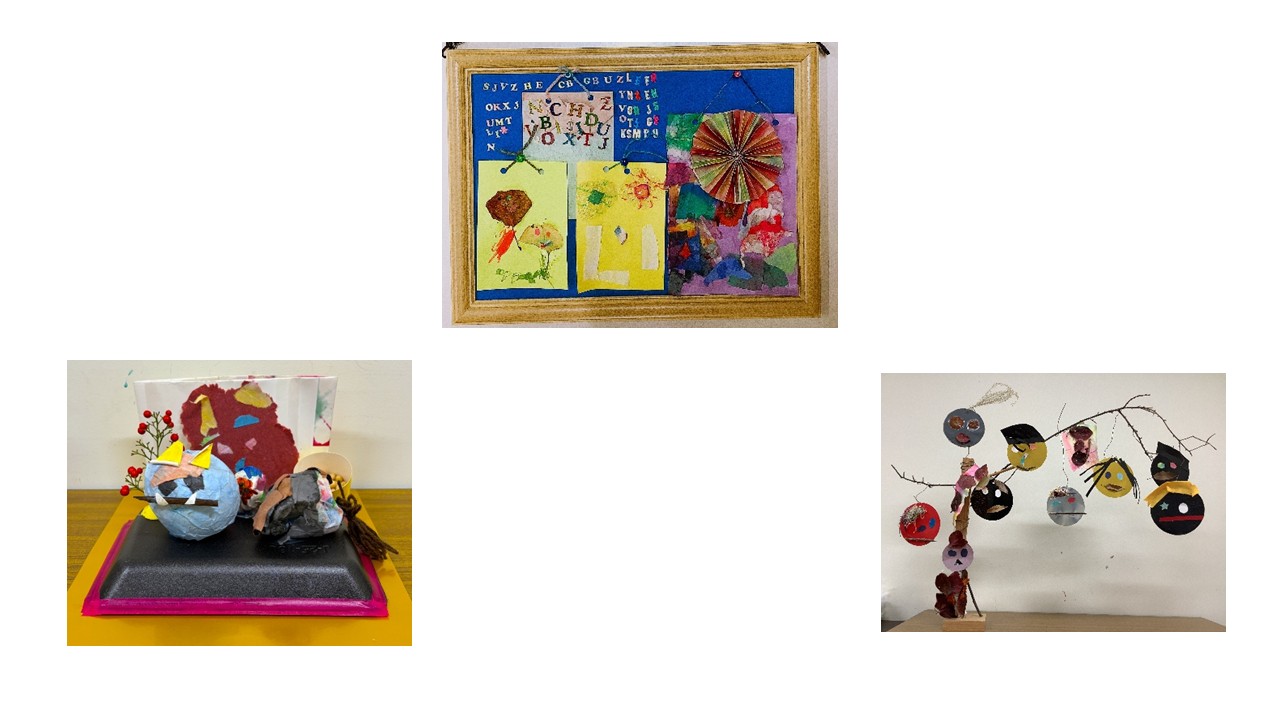 2年「まおねこだるま」(手作りだるま) 2年「鬼ちゃんと福ちゃん」(紙刺しゅう作品)
