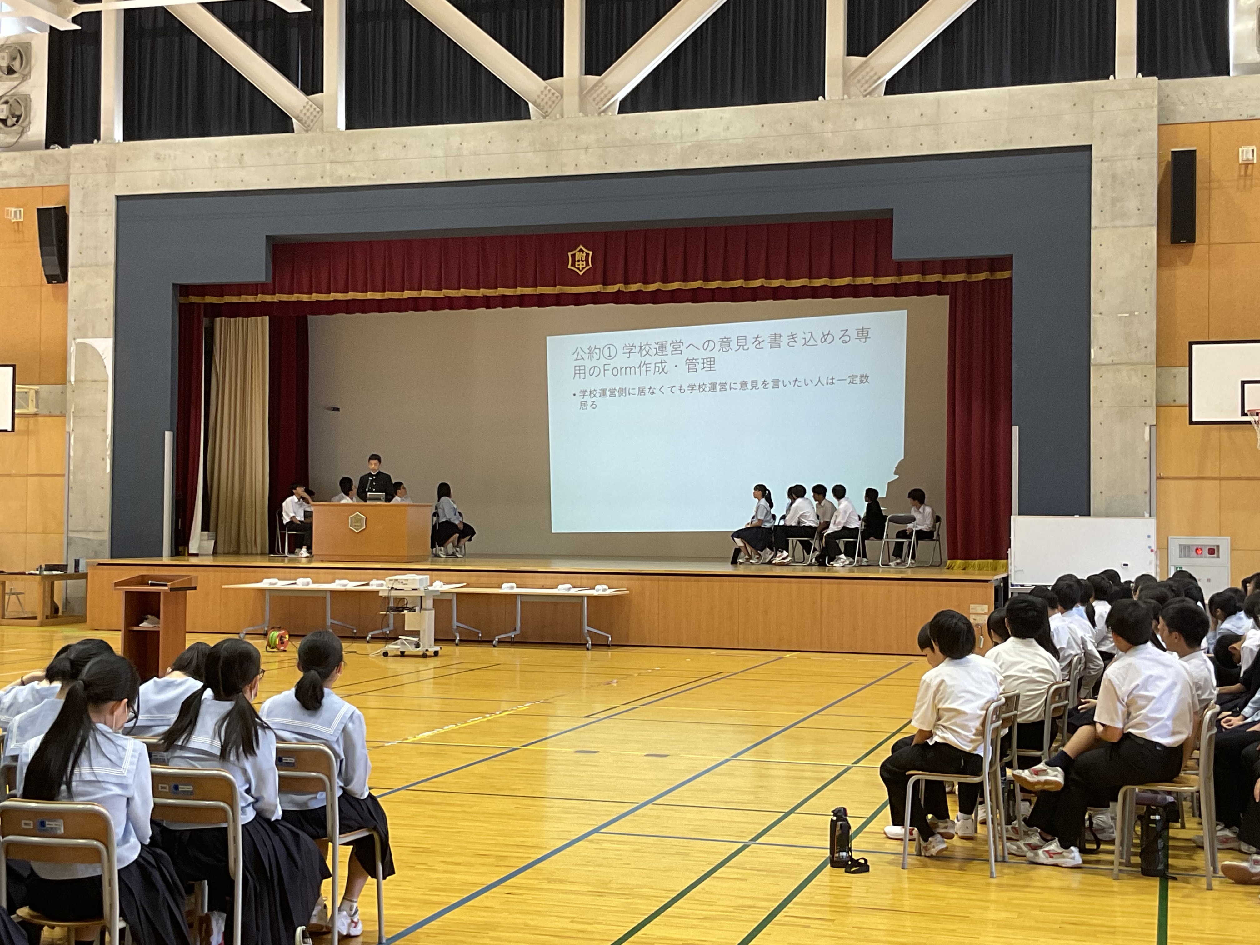 生徒会長2名、副会長3名、書記長1名、会計長1名 が立候補し、それぞれの想いを壇上で語っていました。