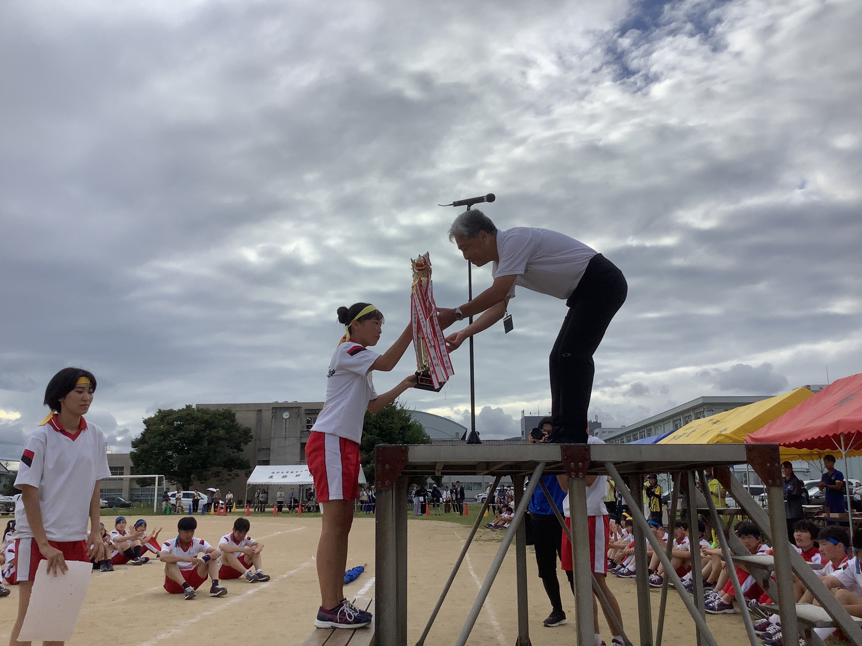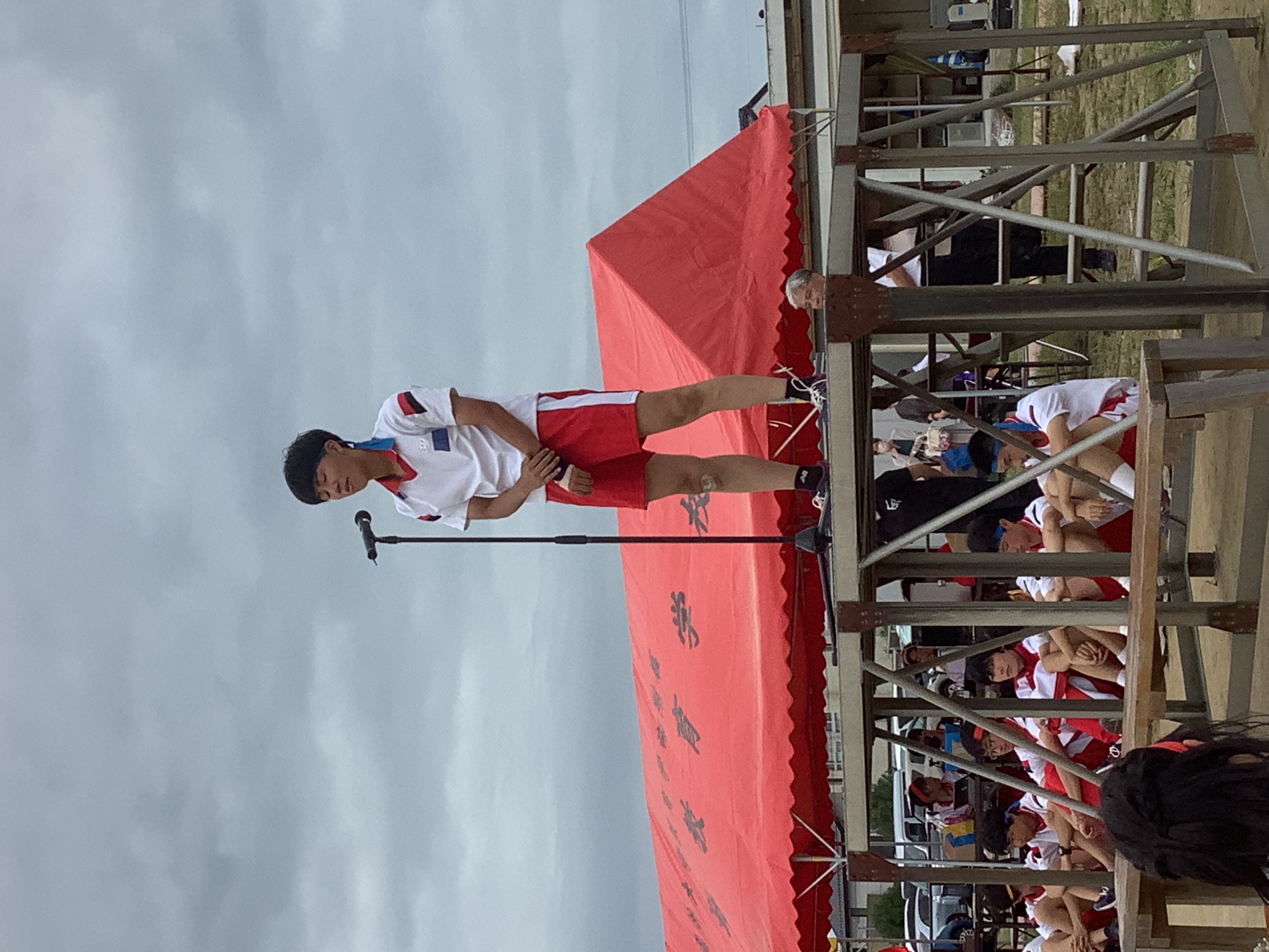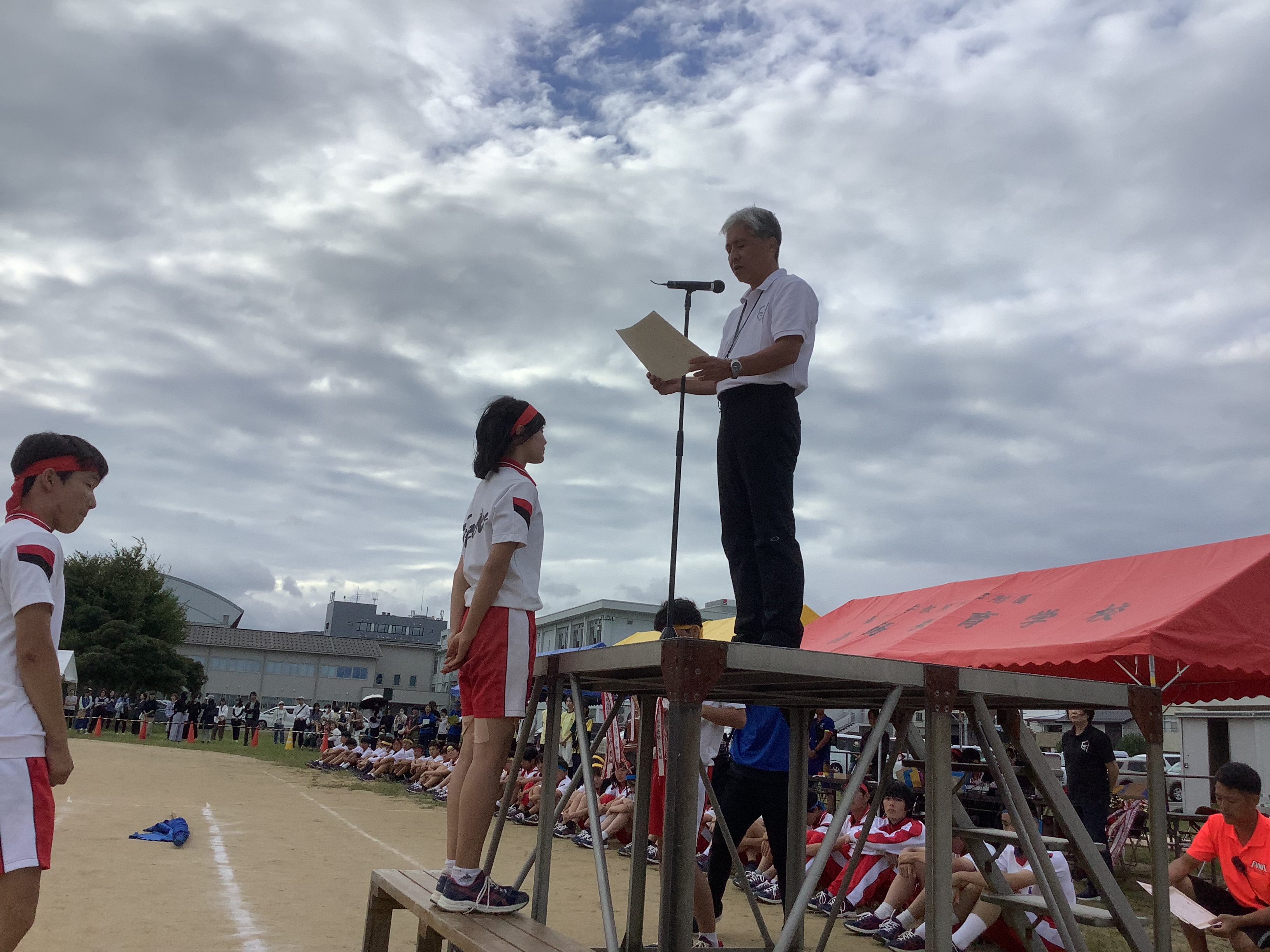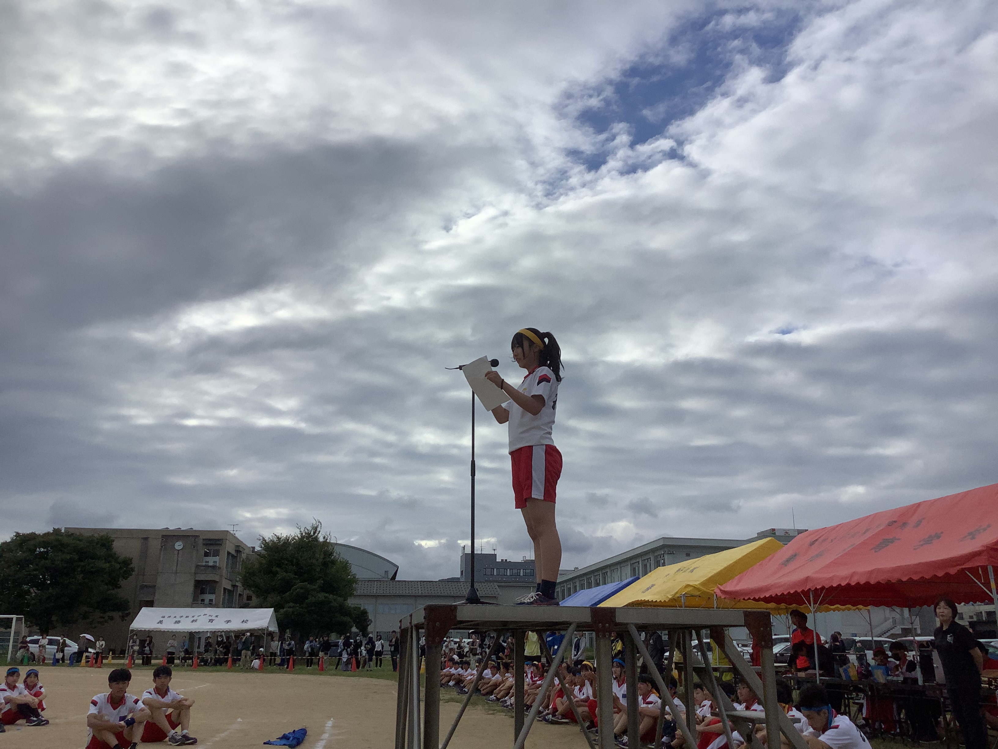 体育祭実行委員長は閉会式で「勝ち負けはありましたが、みんなが楽しめたことが一番です!」と語り、赤組、黄組、青組の応援団長からは、みんなに向けて感謝の言葉が述べられました。