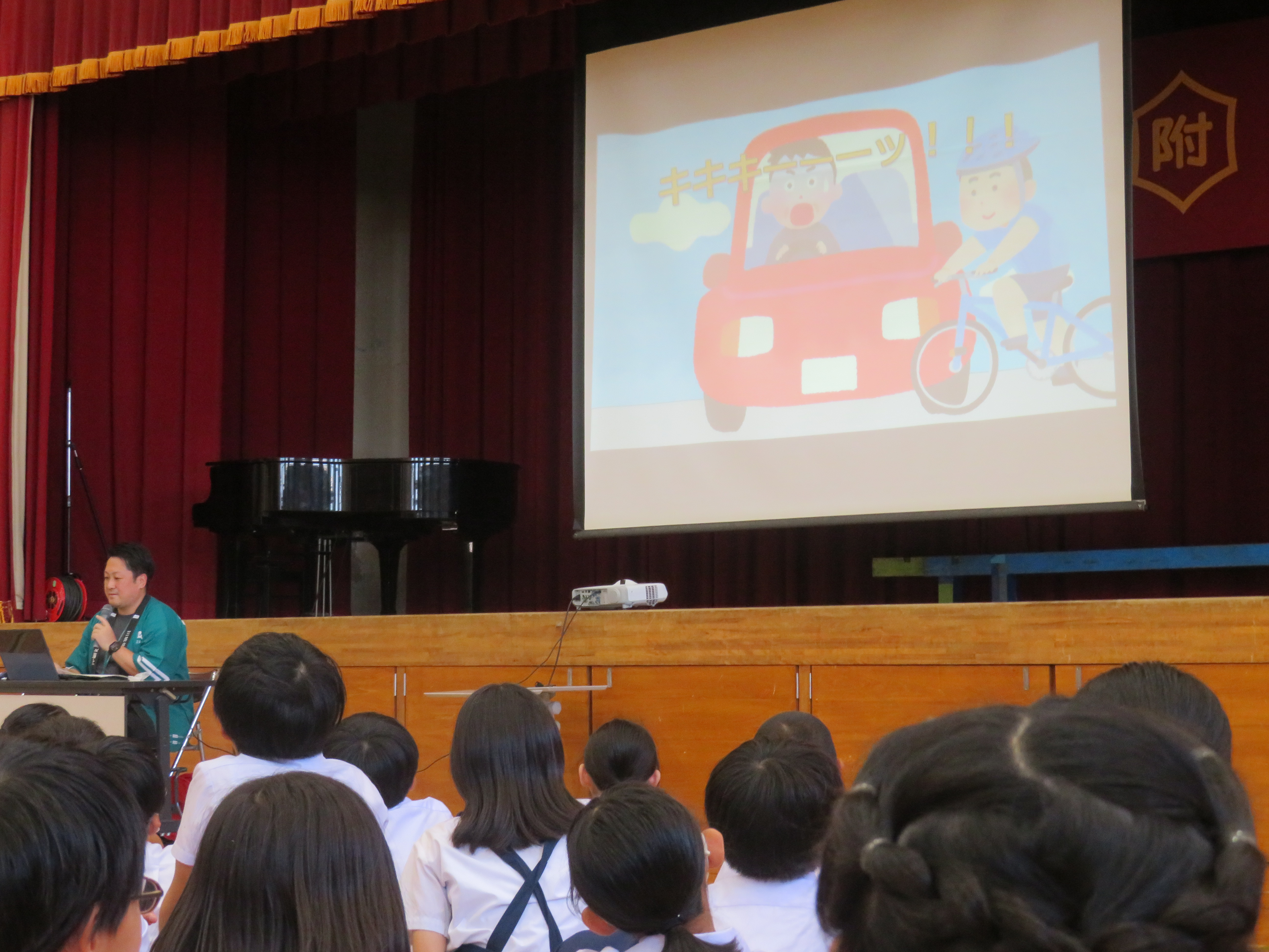10月17日の5時間目に、3年生から6年生までを対象に、交通安全教室が行われました。はじめに福井警察署の方から、講習の内容の説明をお聞きし、その後楽しい劇とプレゼン資料で、守らなければならない大切な3つのことを教えてもらいました。楽しい劇のおかげで、最後まで楽しく参加することができました。終わった後に、感想を発表しましたが、たくさんの子が手を挙げていたこと、そして代表の子の発表内容が、どれもちゃんと今回学習したことを踏まえて、これから自分が気をつけたいことを発表していたところなど、最後までふぞくっ子らしさが感じられました。