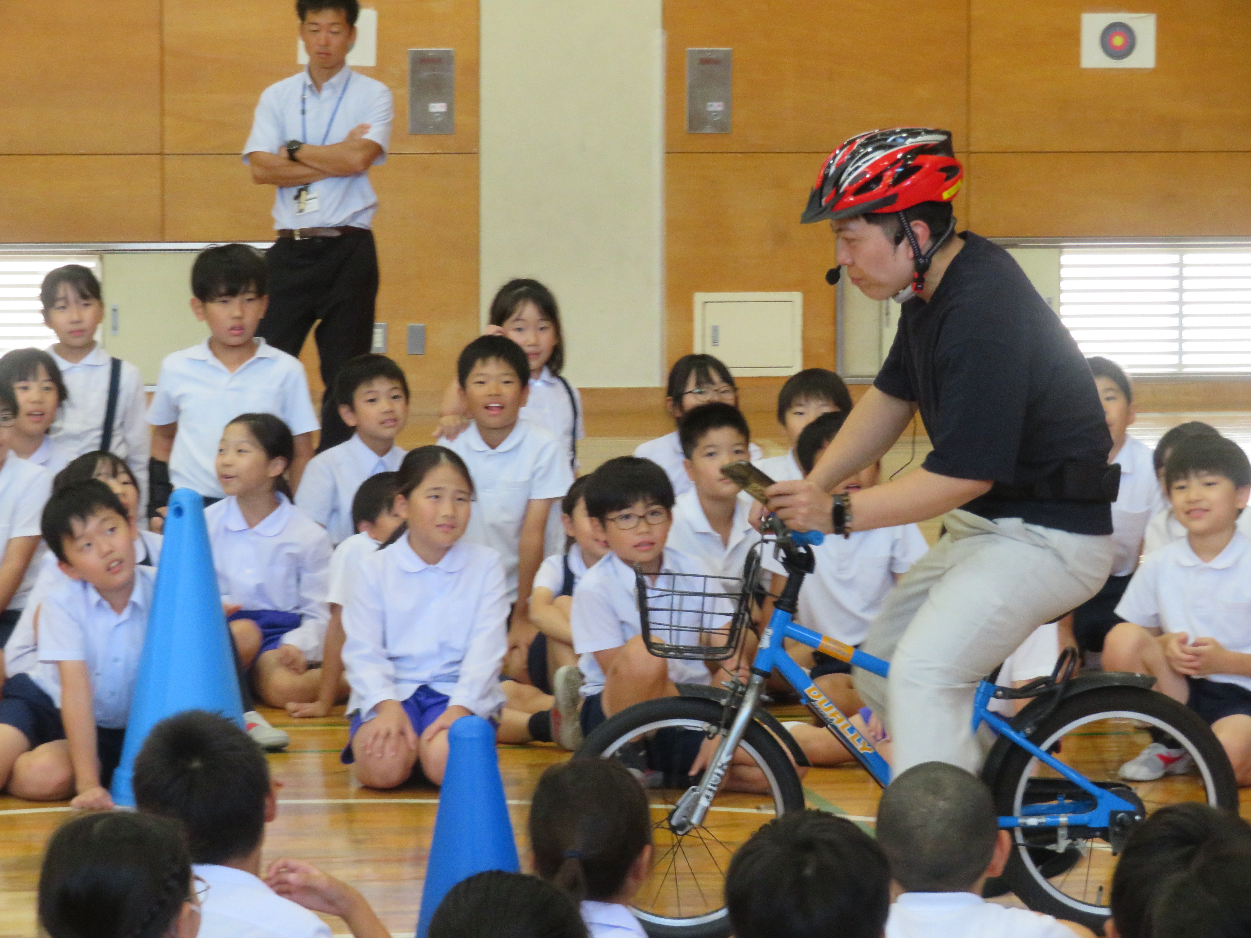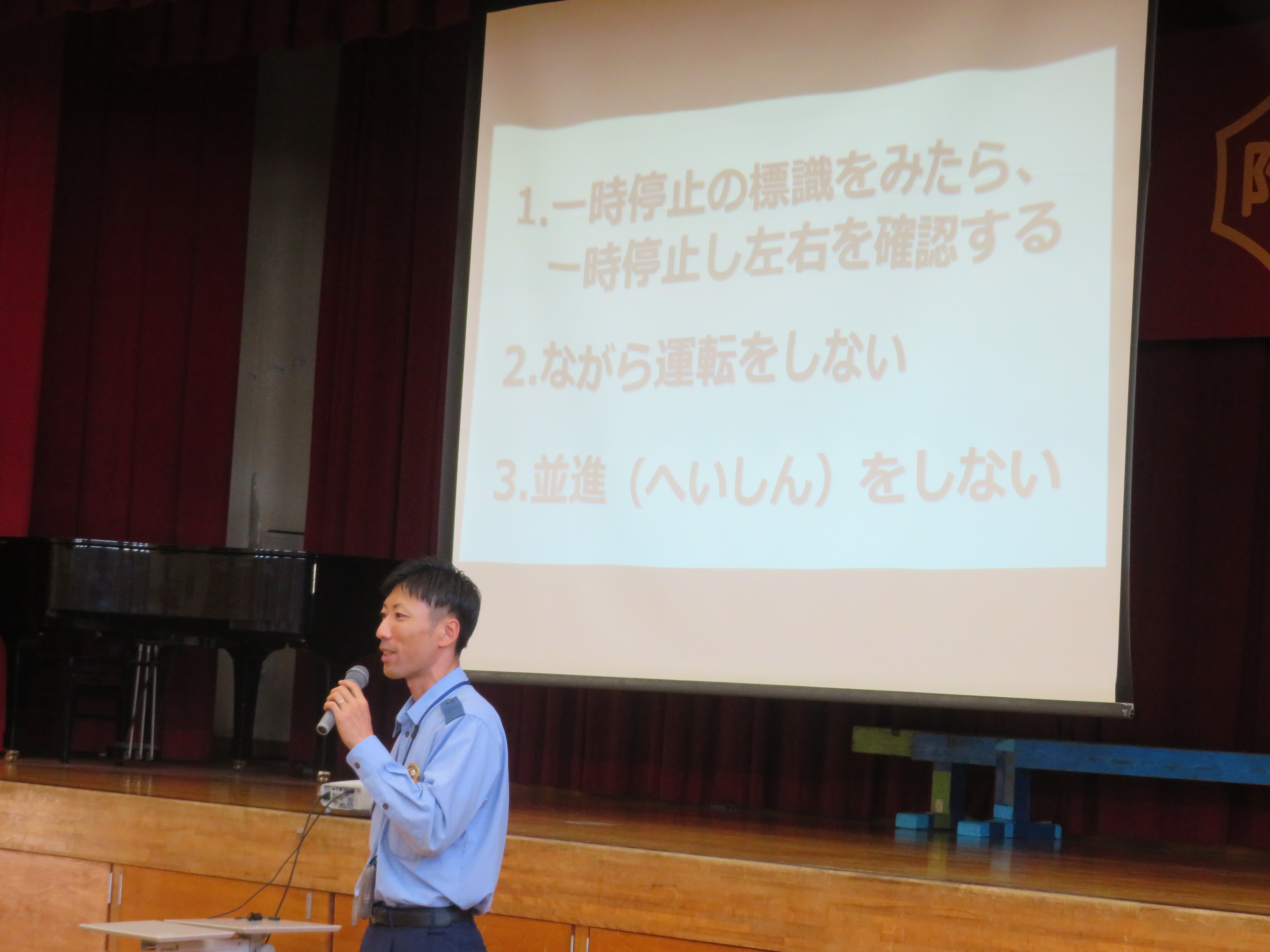 今回の交通安全教室の大切な3つのポイントは、「止まれの標識のところでは止まって左右を確認する。」「ながら運転をしない。」「並走をしない」の3つです。ご家庭でもお子さんが自転車で出かける際には、安全への声かけをお願いします。