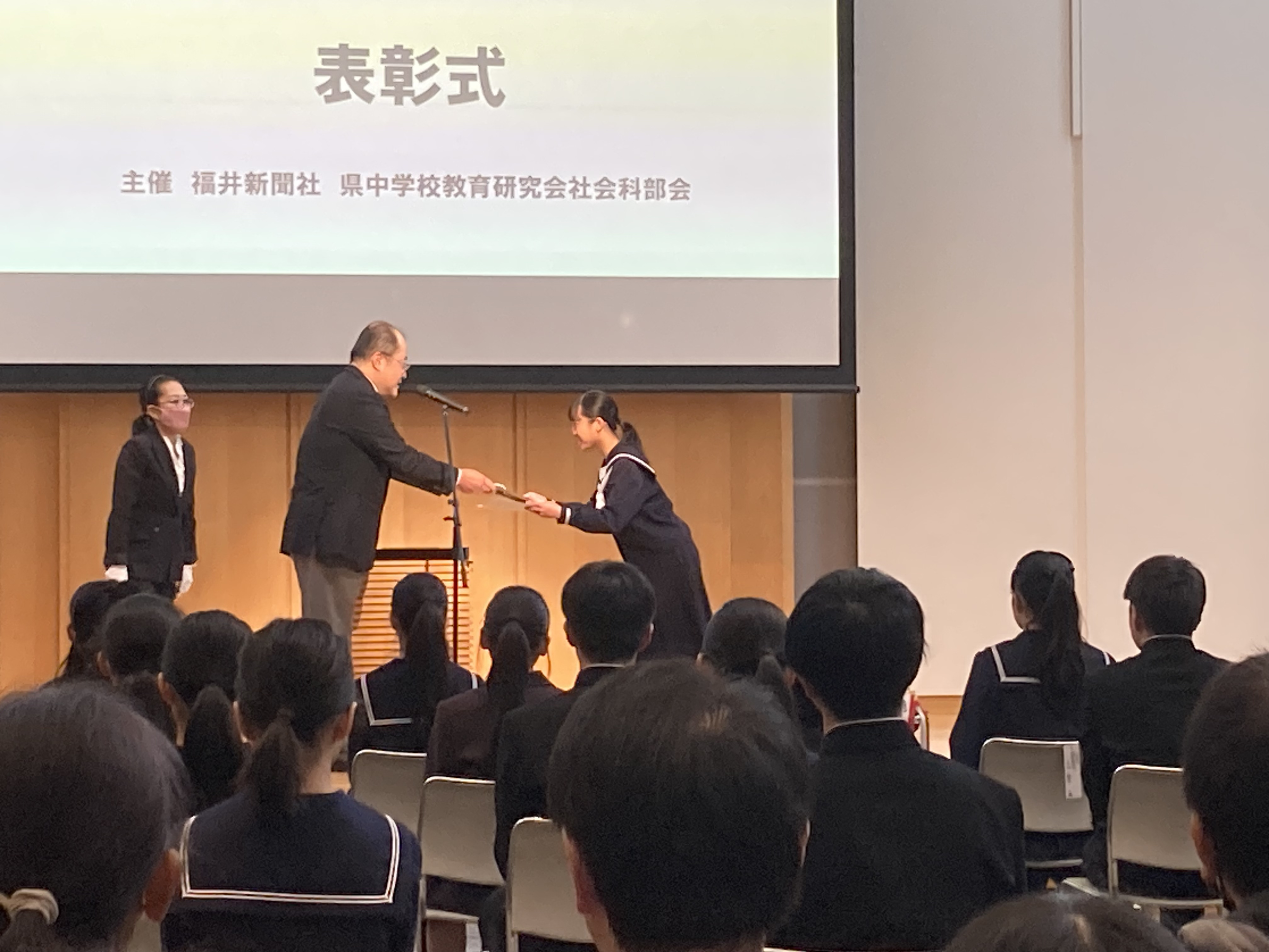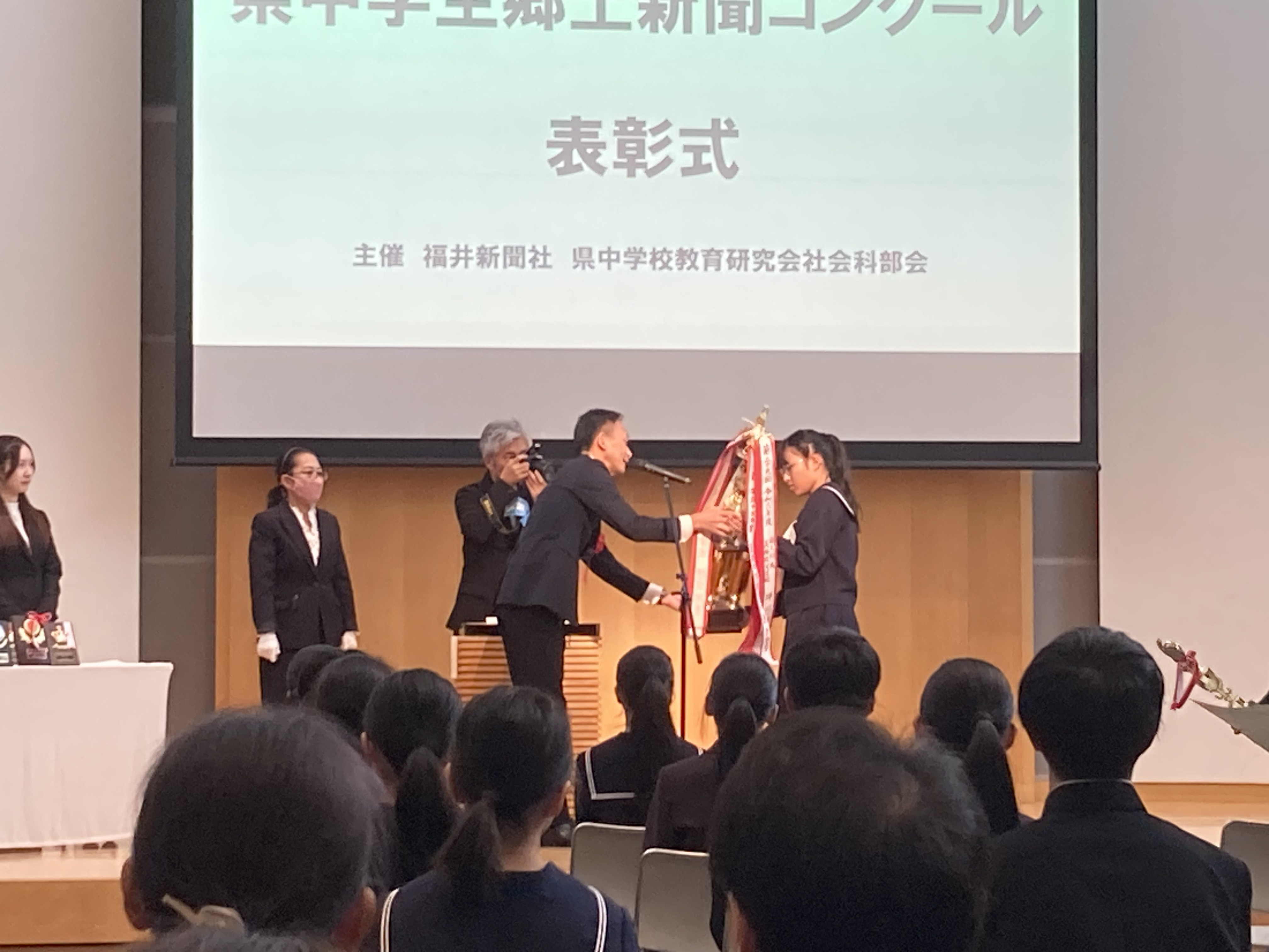 ACTIVITY 活動紹介 ホームchevron_right活動紹介chevron_right8年生chevron_right第30回郷土新聞コンクール 第30回郷土新聞コンクール 2025.11.5 後期課程8年生 11月3日(月・祝)に福井新聞社で郷土新聞コンクールの表彰式が行われました。 本校からは、知事賞 宇山さん 県地理学会賞 木曽さん が上位入賞を果たしました。 表彰式では、自分がこの新聞作成に込めた思いをスピーチしました。 知事賞は2年連続の快挙です。ほんとうにおめでとうございます!