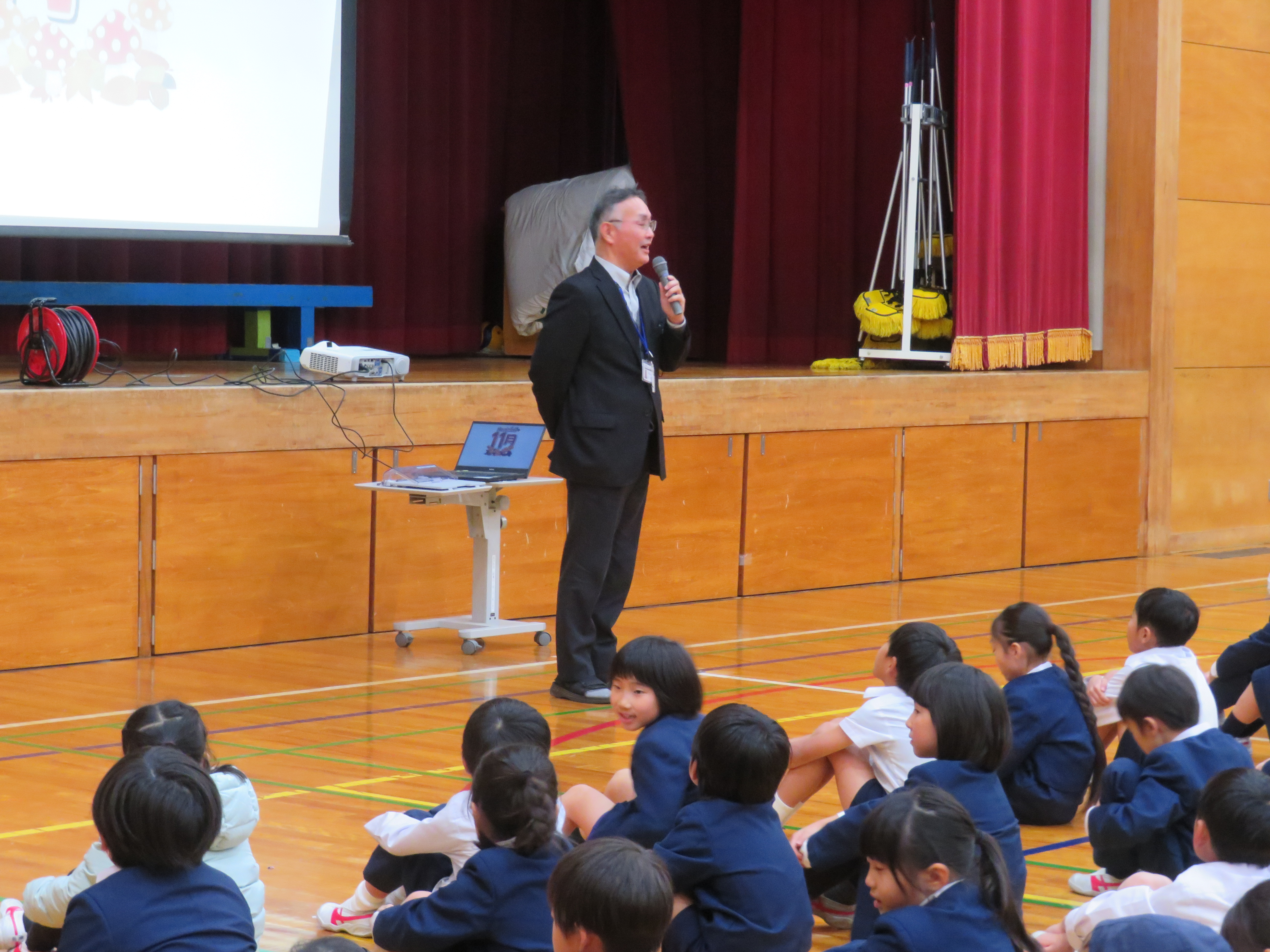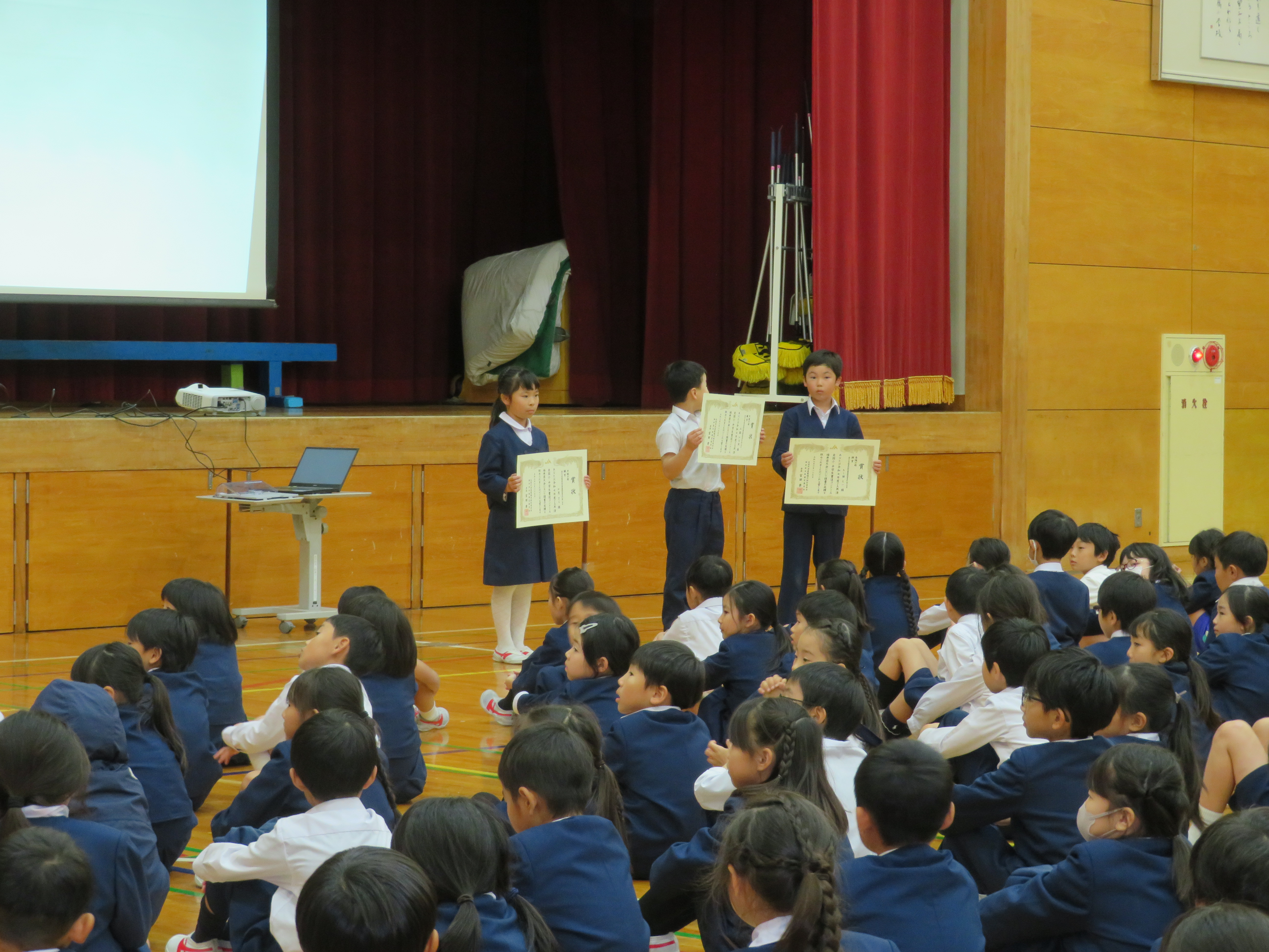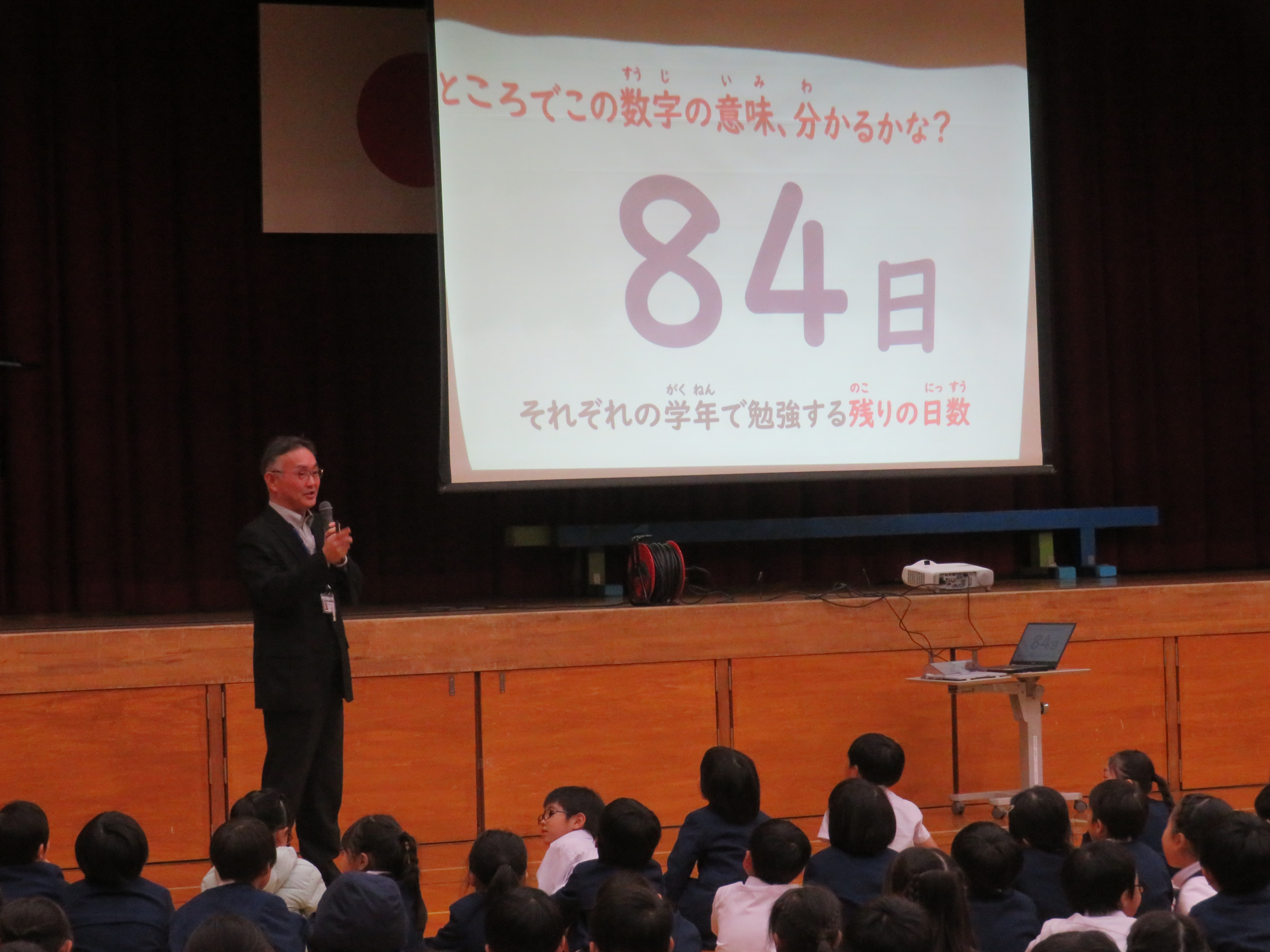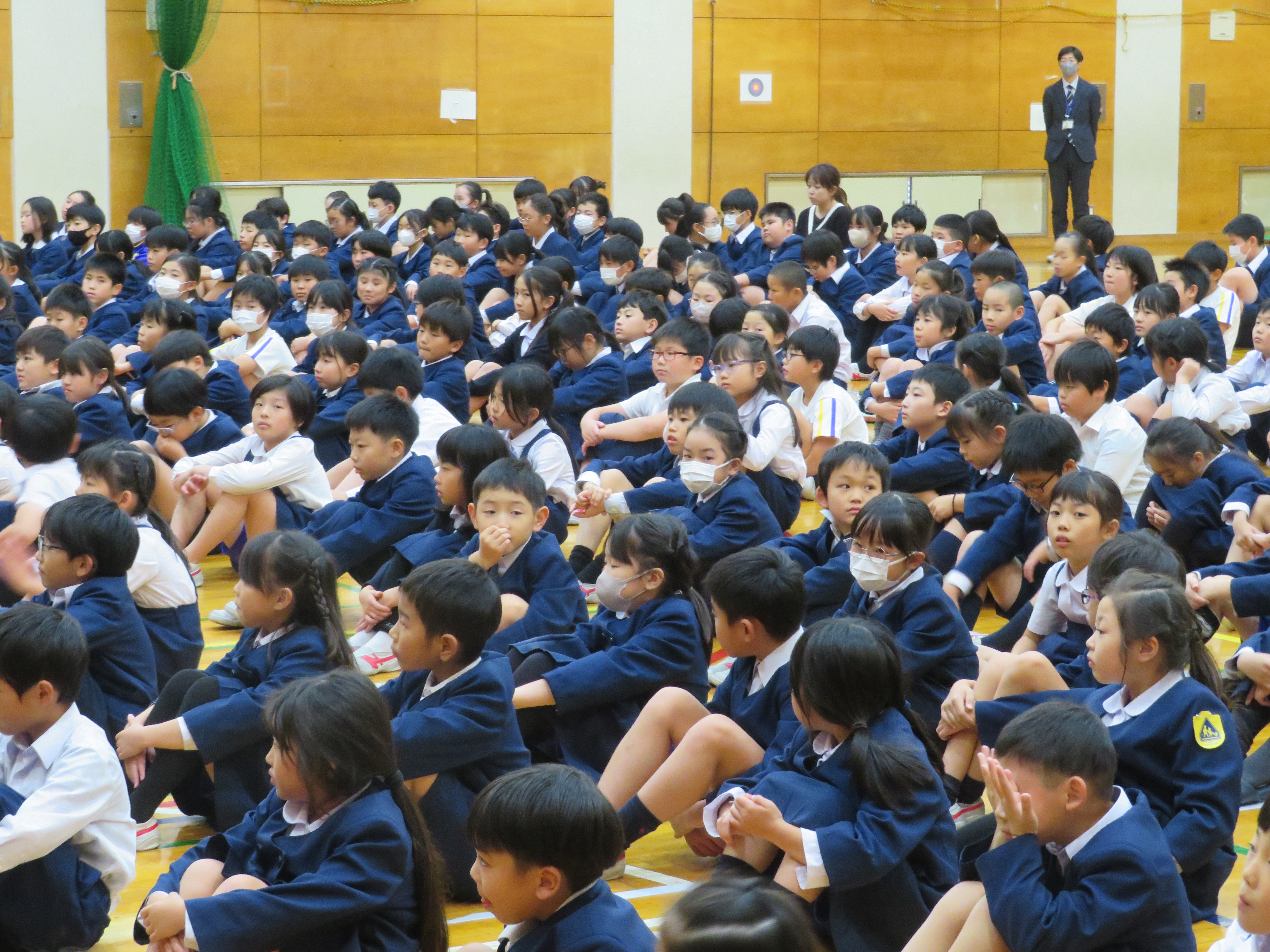 11月11日に、久しぶりに前期課程全学年が一堂に会しての集会が行われました。校歌を歌った後、副校長先生のお話を聞きました。今回「立冬」という言葉から季節に関する話と、「84」という数字から、現在の学年の登校日をいかに過ごすかという話につなげて話されました。児童代表の感想の中にも、残りの日数を有意義に過ごしたいと発表されていました。