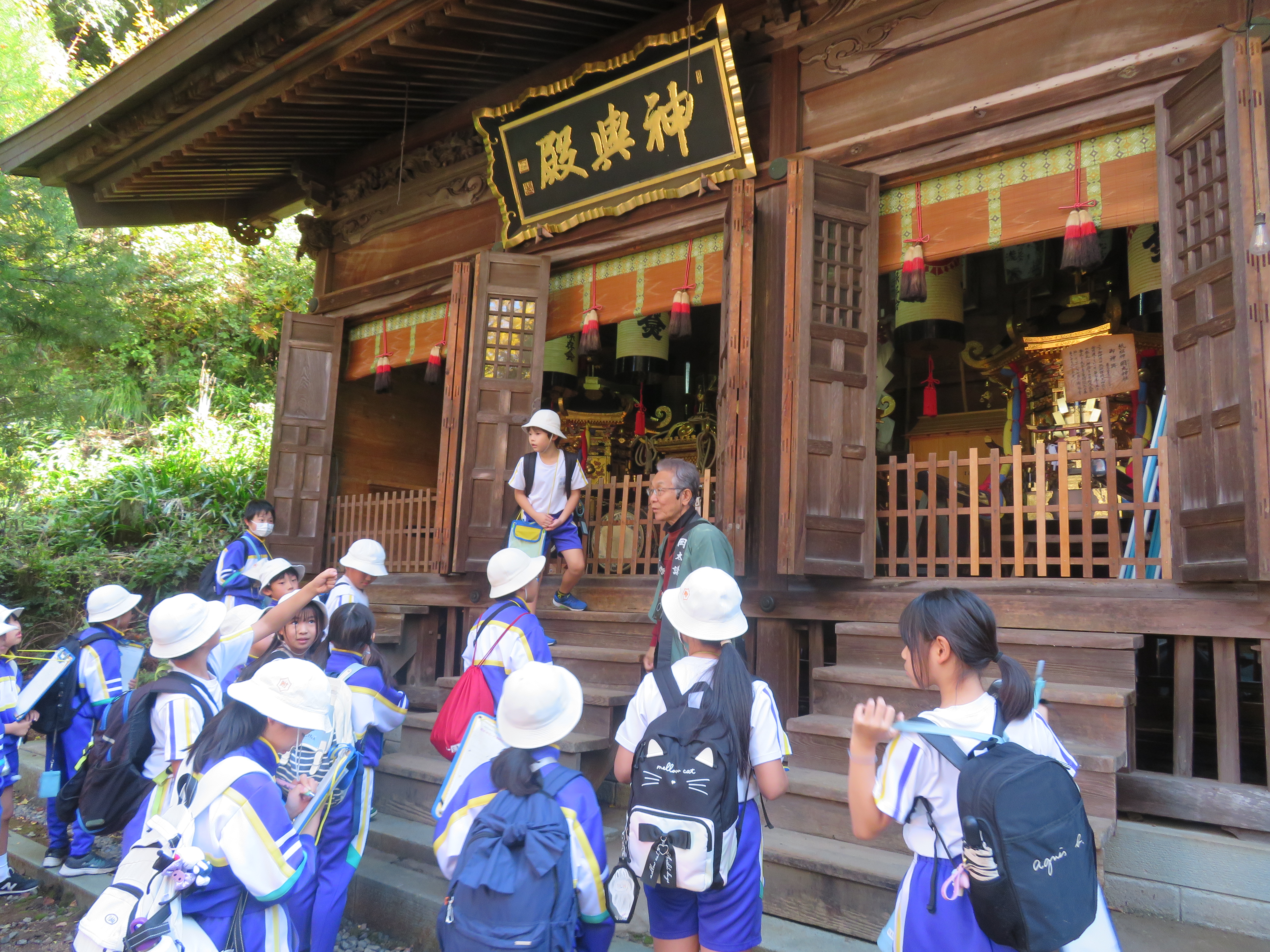 ボランティアガイドの方の説明を聞きながら、神社の由来や、関連する行事、拝殿のつくりについて説明を受けました。