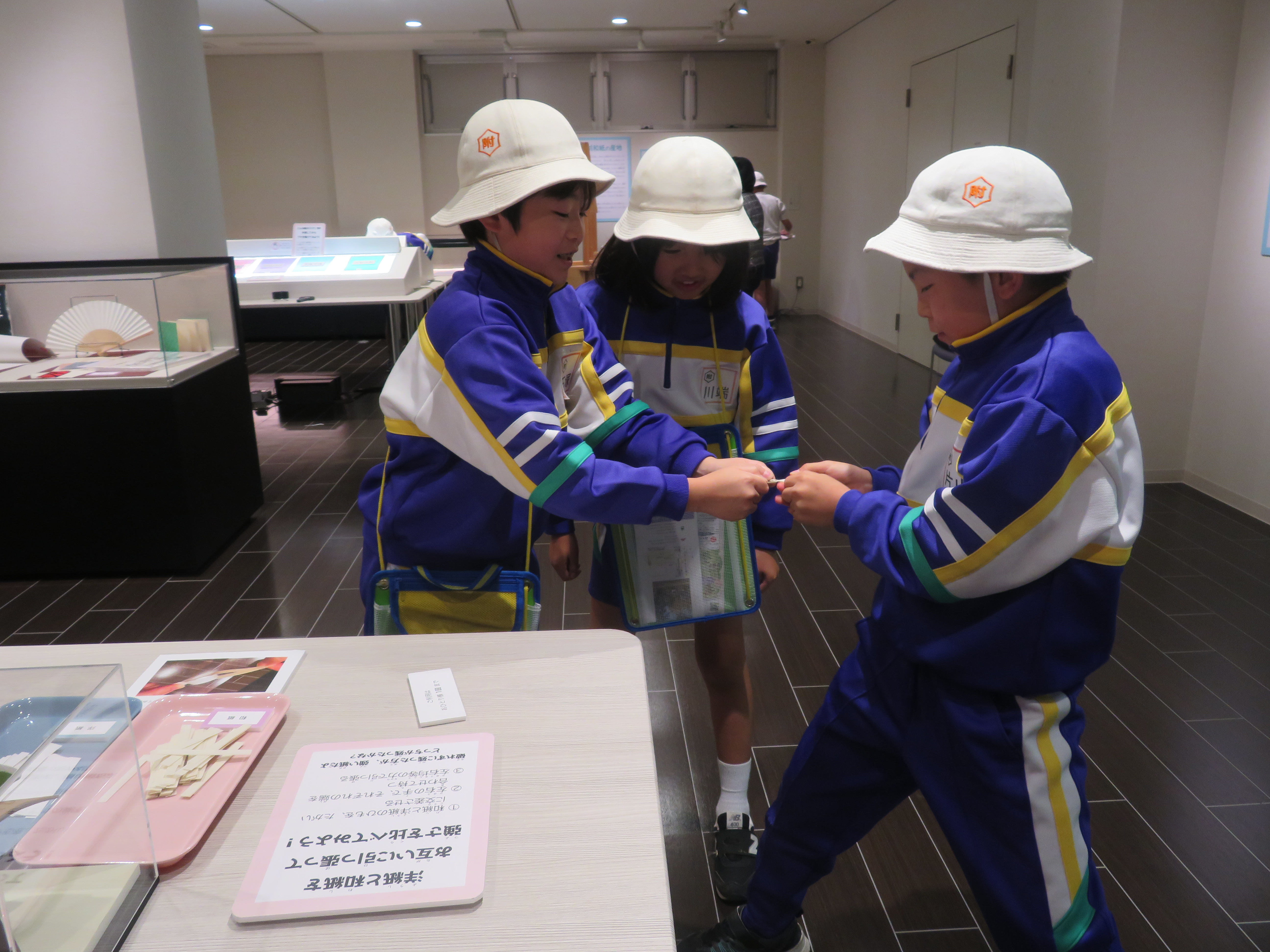 越前和紙について紙の文化博物館で展示されているいろいろな展示物から学習しました。子供たちがとくに興味を示したのは、和紙と用紙の強さ比べでした。