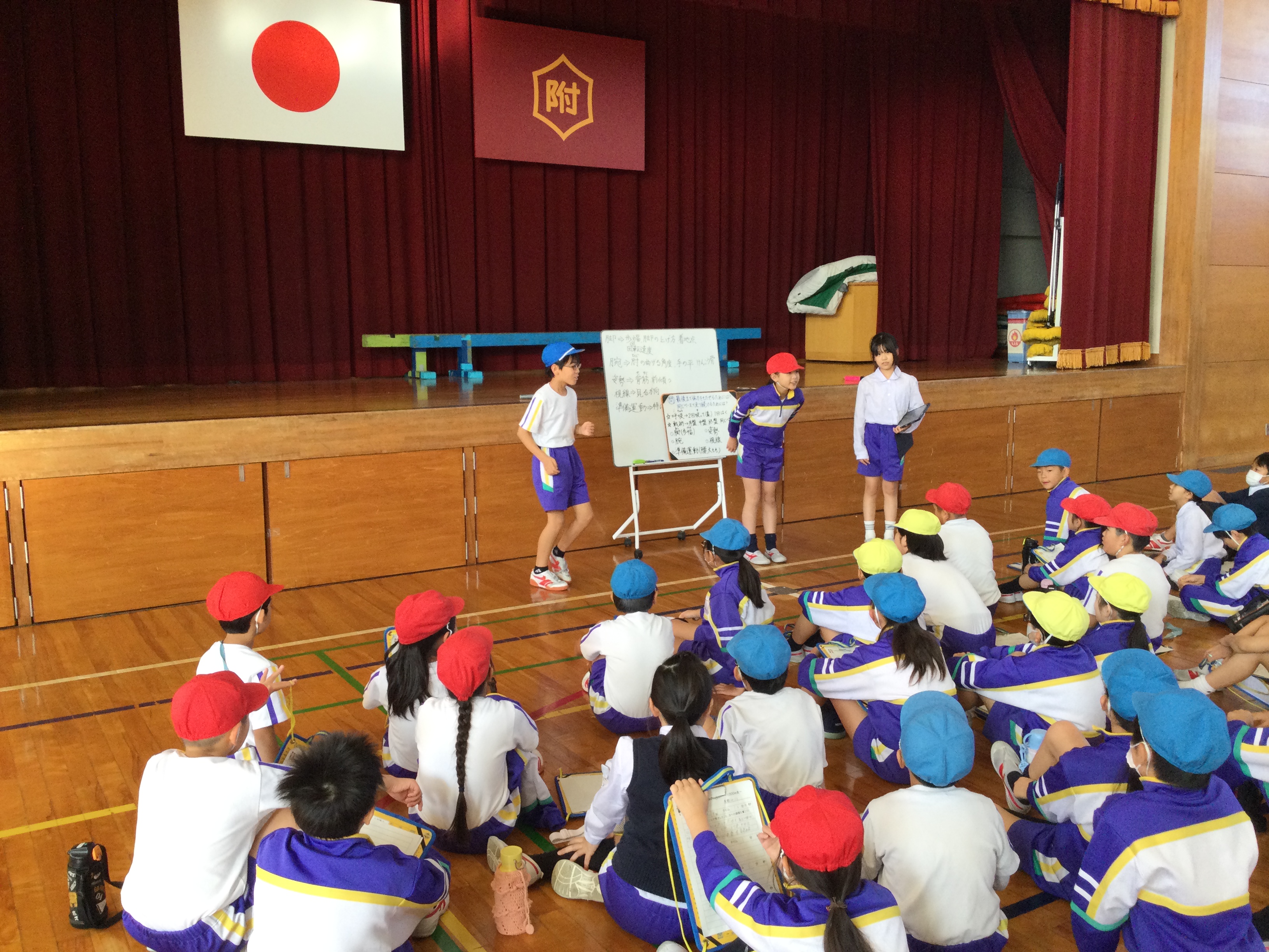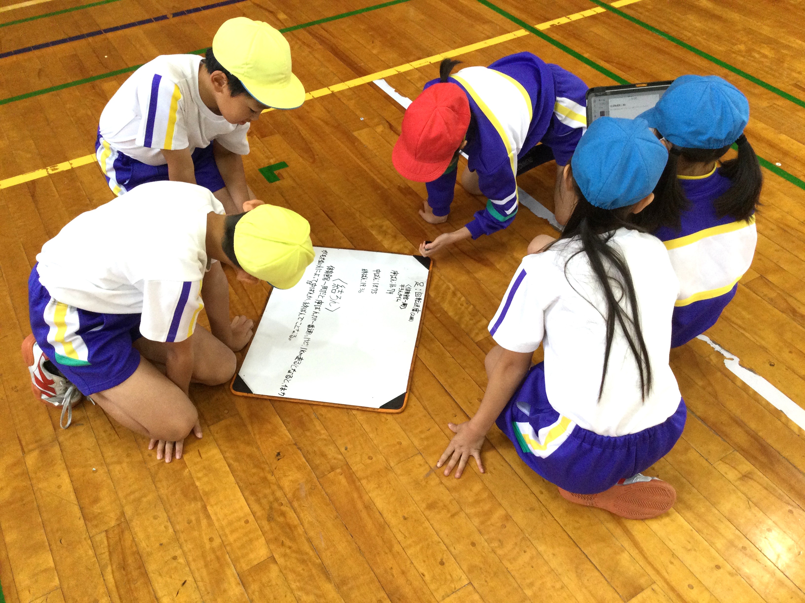 約1か月にわたって取り組んできた1000m走も佳境。脚や腕、姿勢、呼吸、準備運動などそれぞれ考えたいポイントでチームを組み、探究を続けてきました。互いにアドバイスをしたり、励まし合ったり、ICT機器を使って客観的に走る様子を観察したりするなど、様々な方法で取り組みました。グループごとに探究した内容を聴いた時には「なるほど…」、「試してみよう」と次への意欲を高めていました。