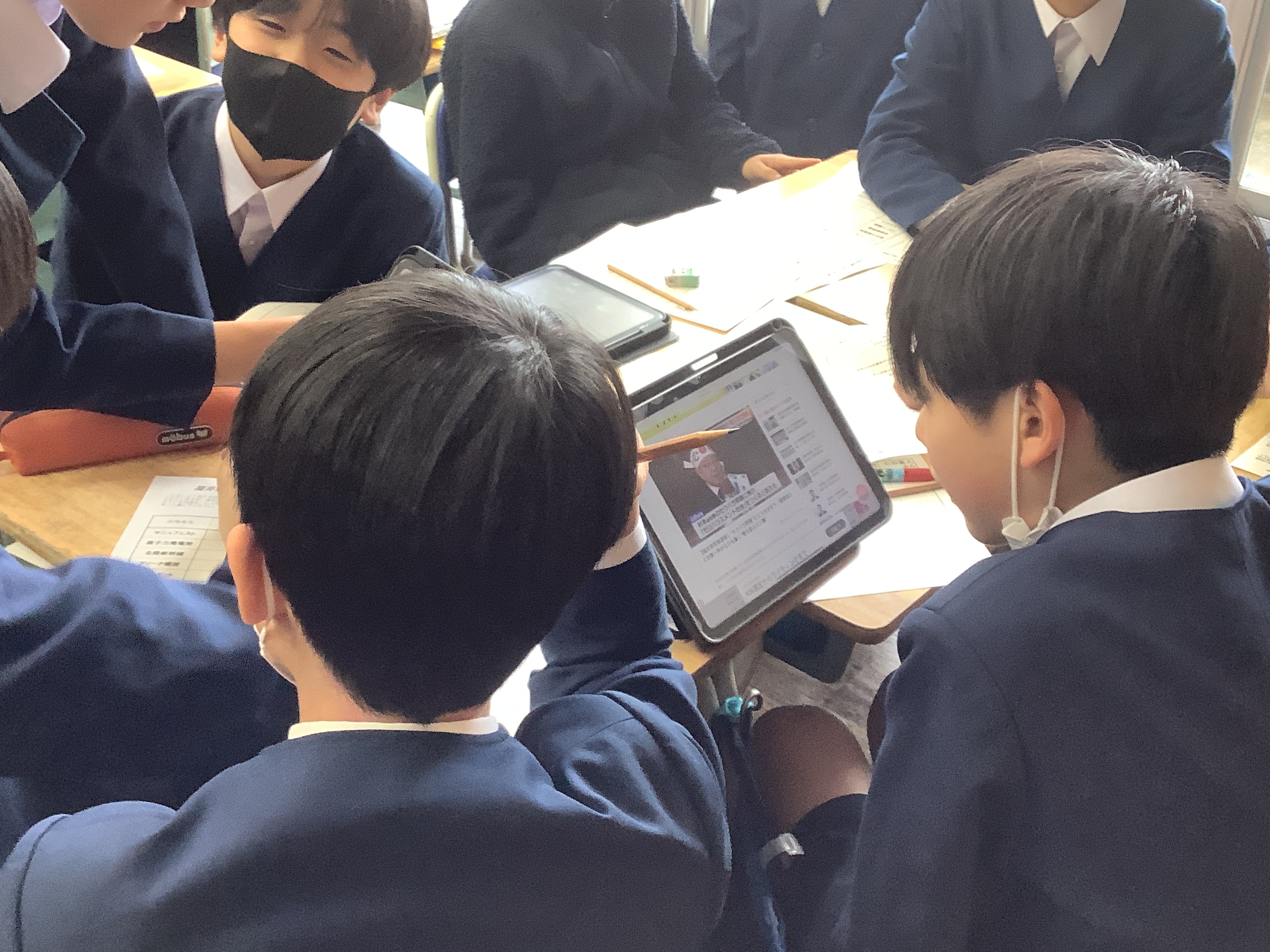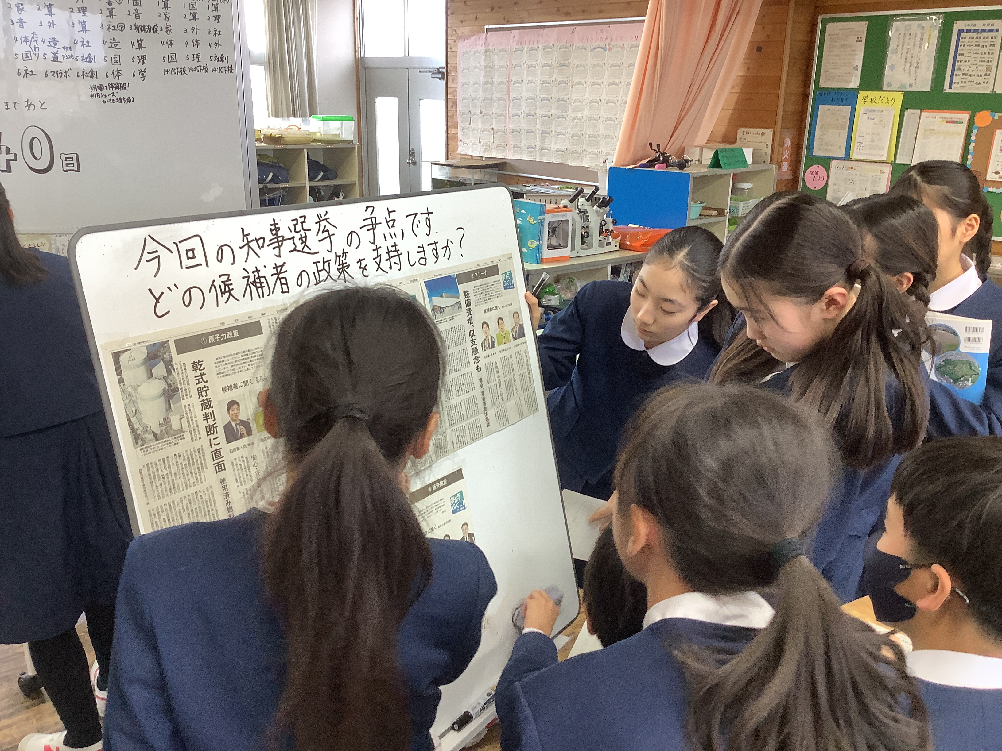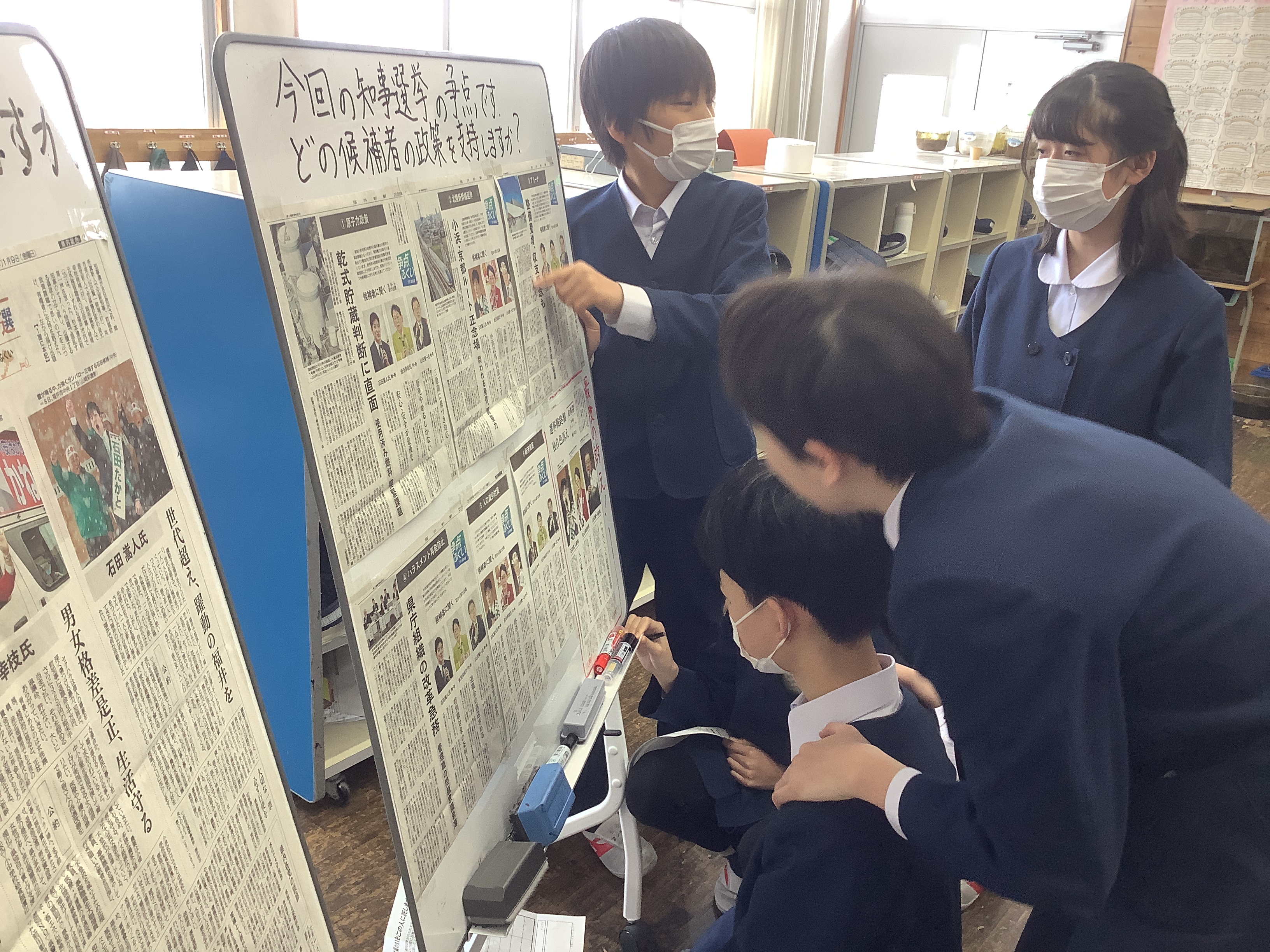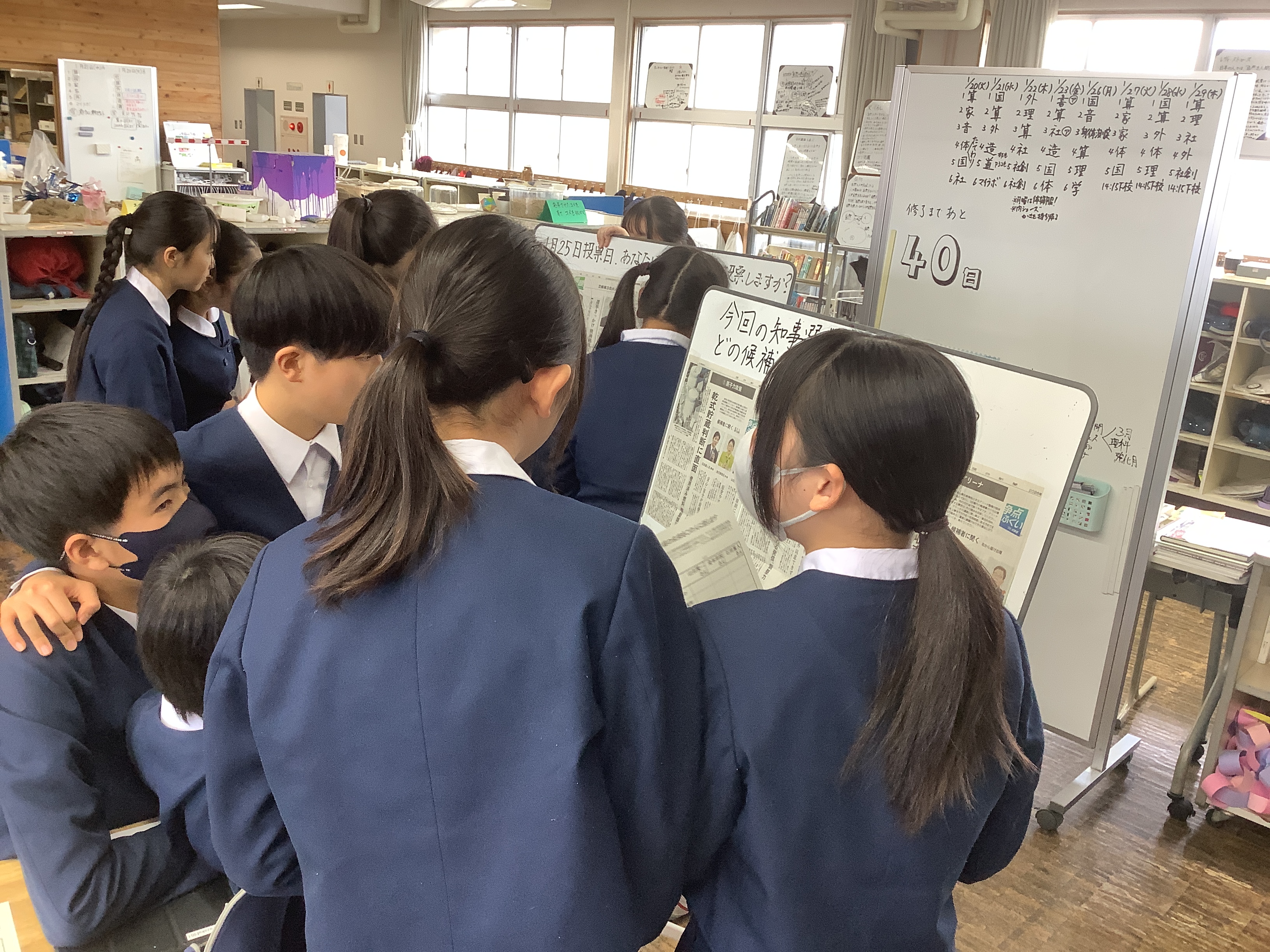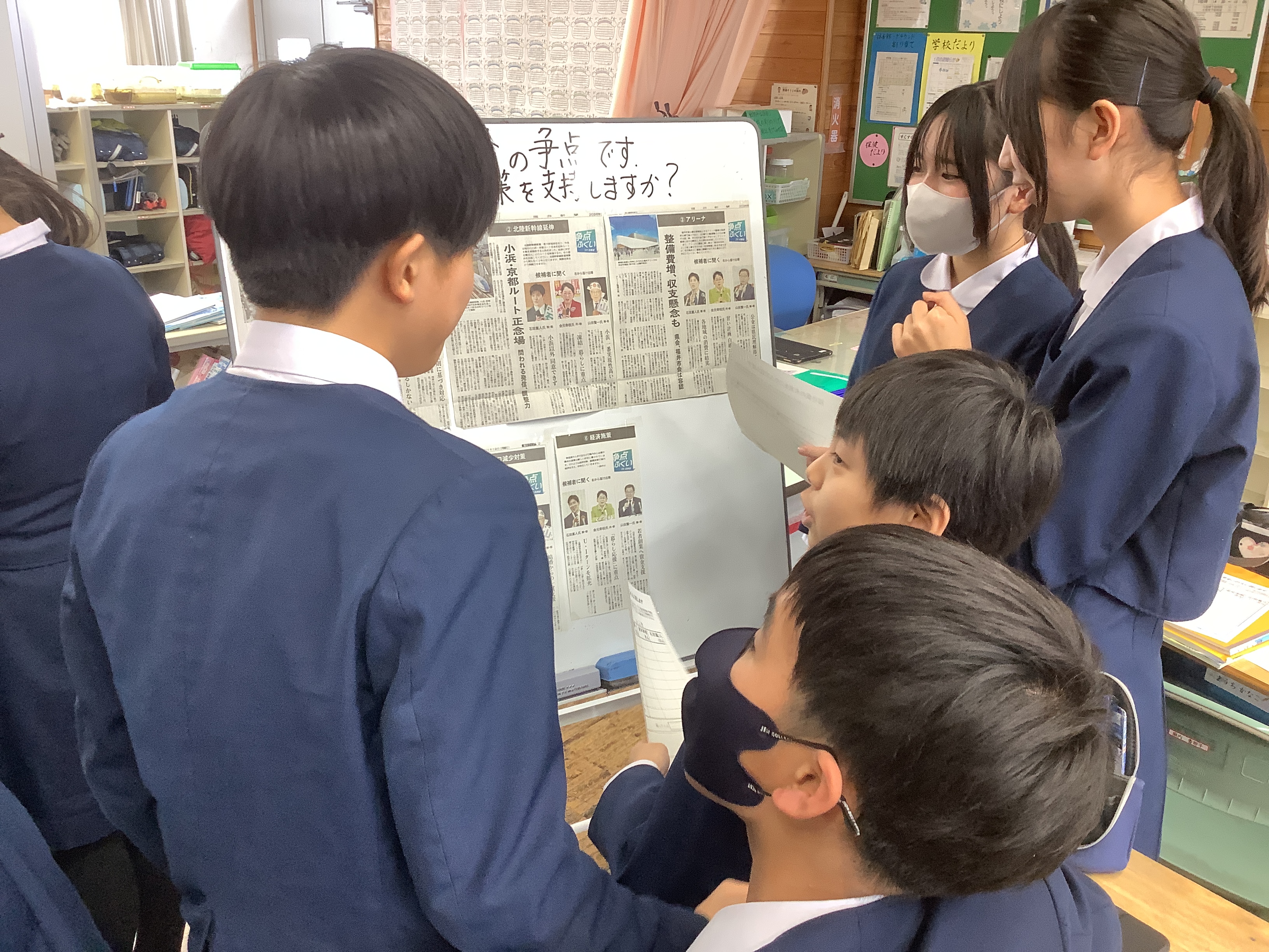 1月25日に福井県知事選挙が実施されることもあり、社会科の授業の中で実際の県知事選挙関連の新聞記事を使った授業を行いました。6年生の子供たちに、新聞に紹介されている各候補者の考えを掲示して紹介し、自分ならどの候補者に投票するかを考える授業です。新聞の中で今回の選挙の争点として取り扱われている記事や、各戸配布される選挙公報なども併せて紹介し、それぞれの主張を各個人が評価して、最終的にどの候補者を選ぶかを考えました。それぞれの候補者の考えが書かれた新聞記事を読み込み、精査しながらそれぞれの候補者の政策について議論する姿に、子供たちの中にしっかりと公民的資質が育ってきていることが実感できました。