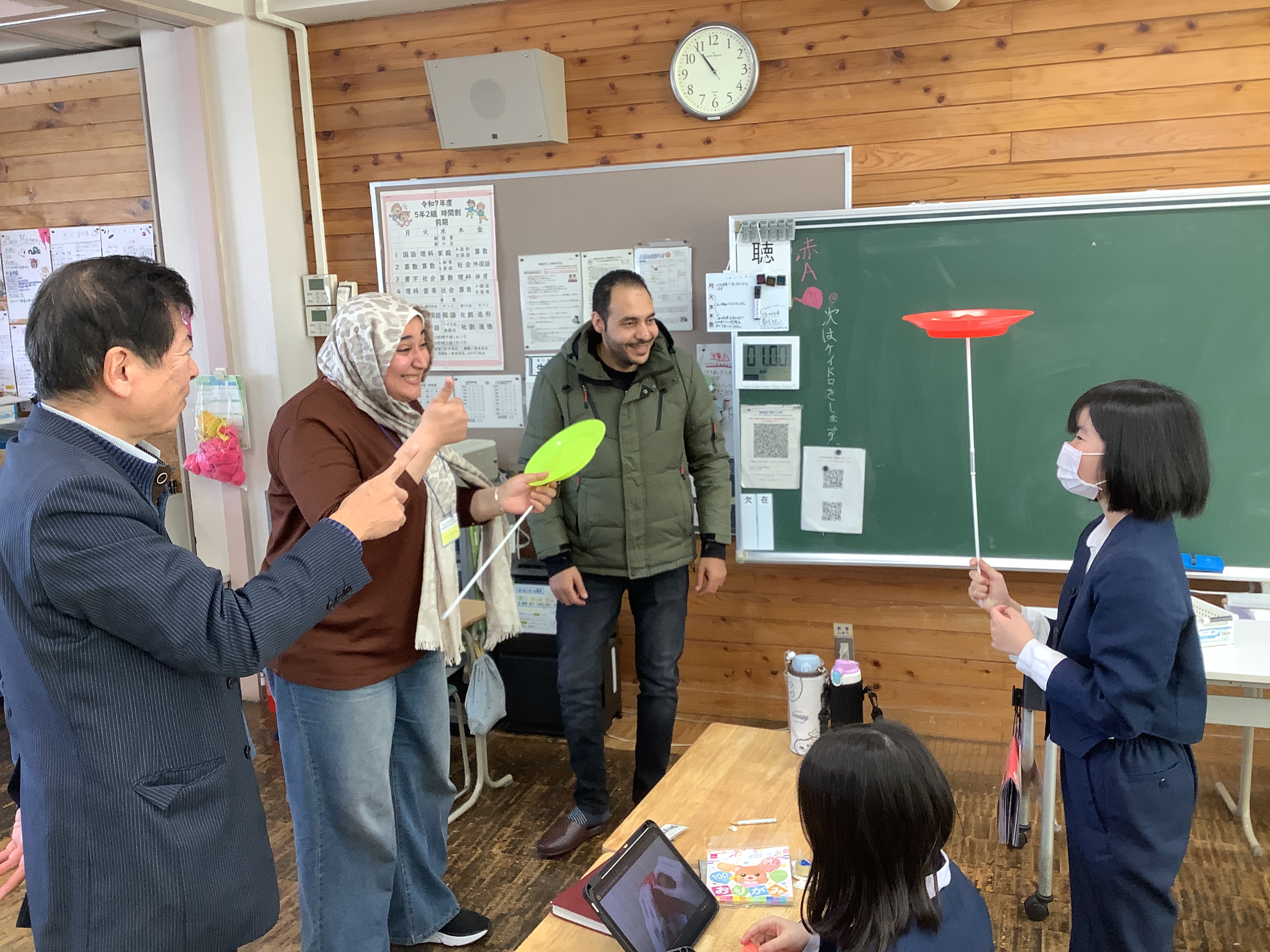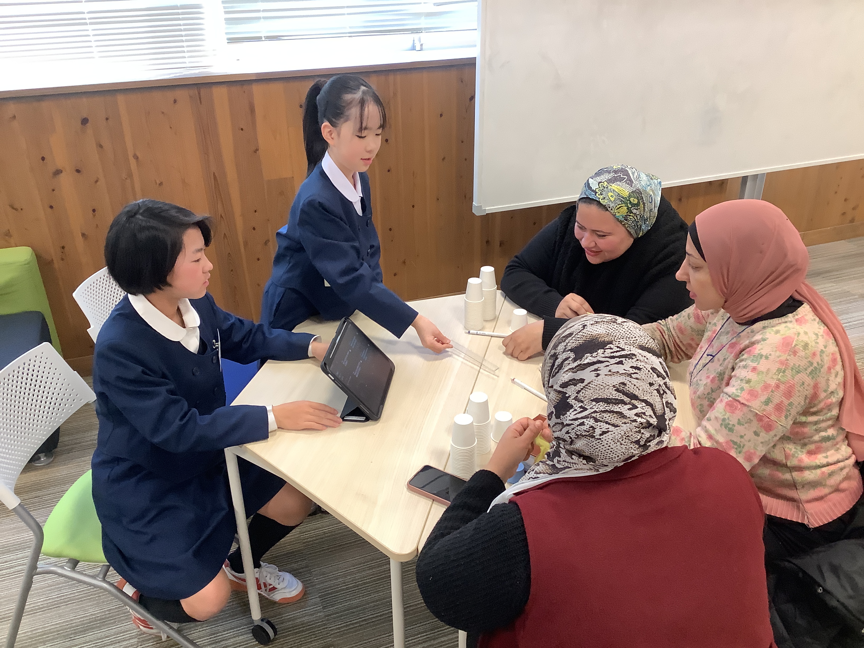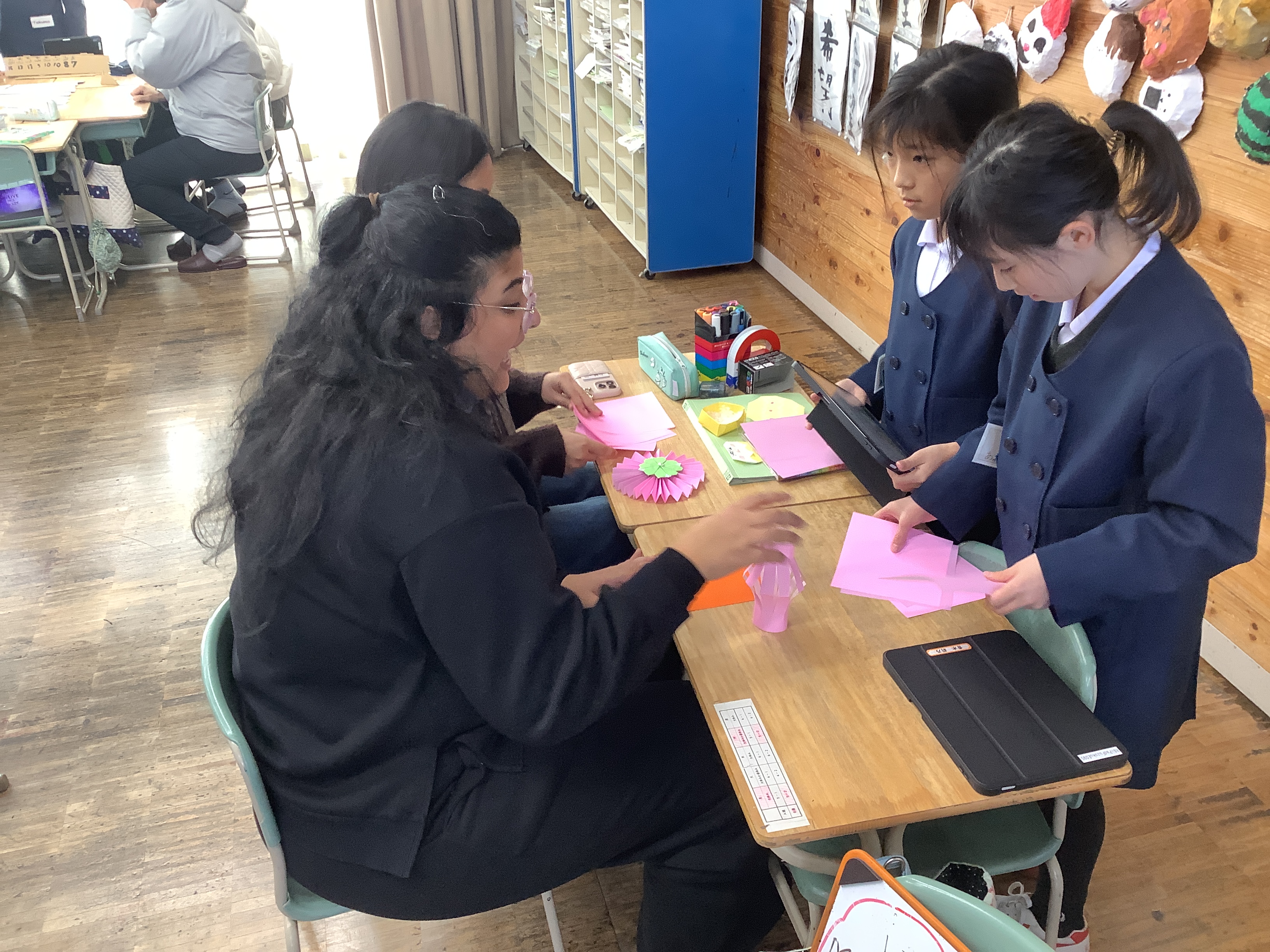 自己紹介を終えた子供たちは、早速それぞれ紹介する日本文化を体験してもらい、交流しました。エジプトの方々からも、コメントや質問があり、子供たちは相手の話に耳を傾け、時には協力して内容を理解したり、返答やさらなる質問をしたりしていました。 これまでの交流の経験、学習してきた表現を総動員して、子供たちはエジプトの方々との有意義な時間を過ごしました。今後は、子供たちとこれまでの学びを確認しながら、次年度に向けた外国語の学習の未来図を描き始めます。