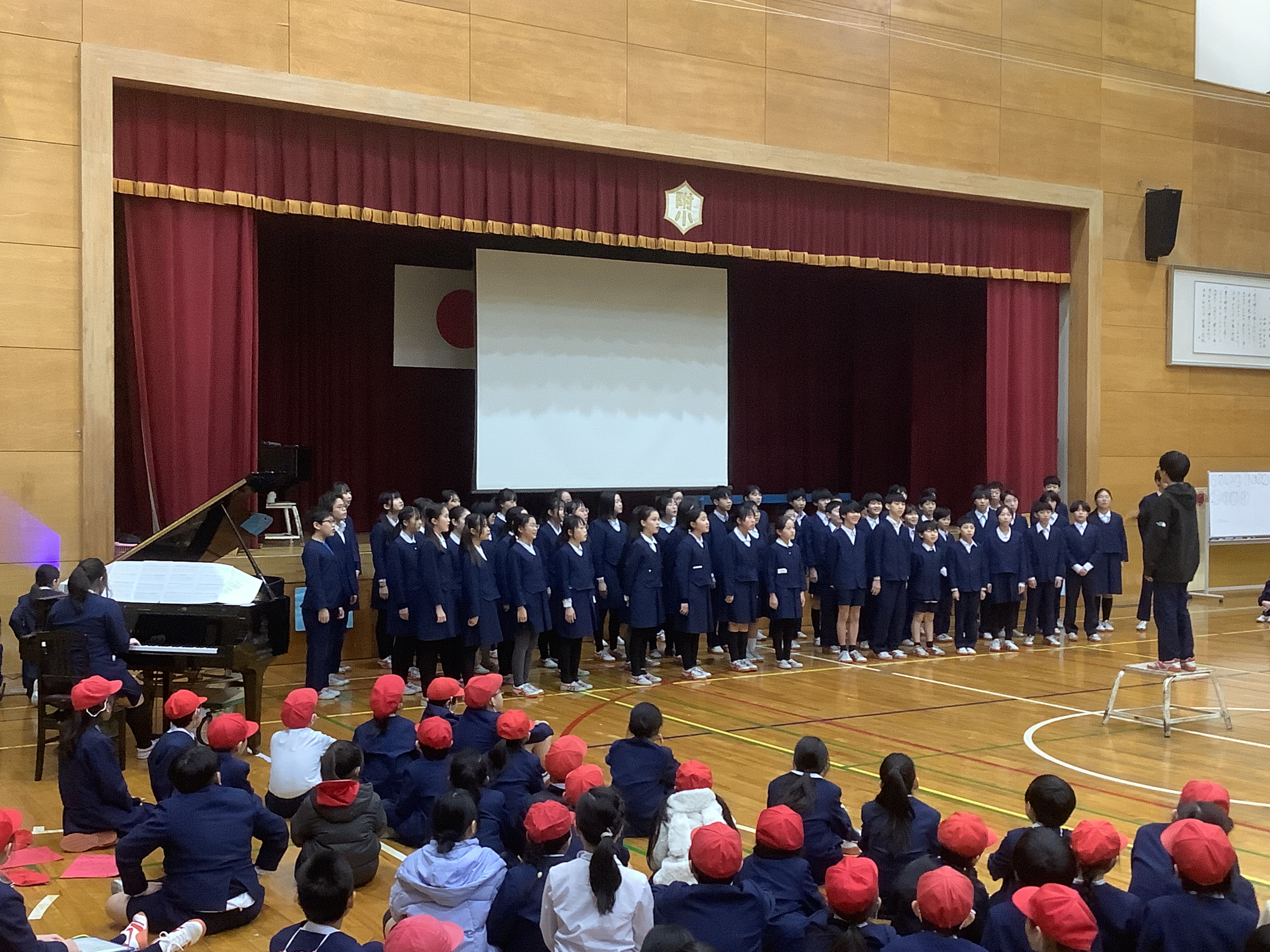 全校児童の前で6年生の合唱披露