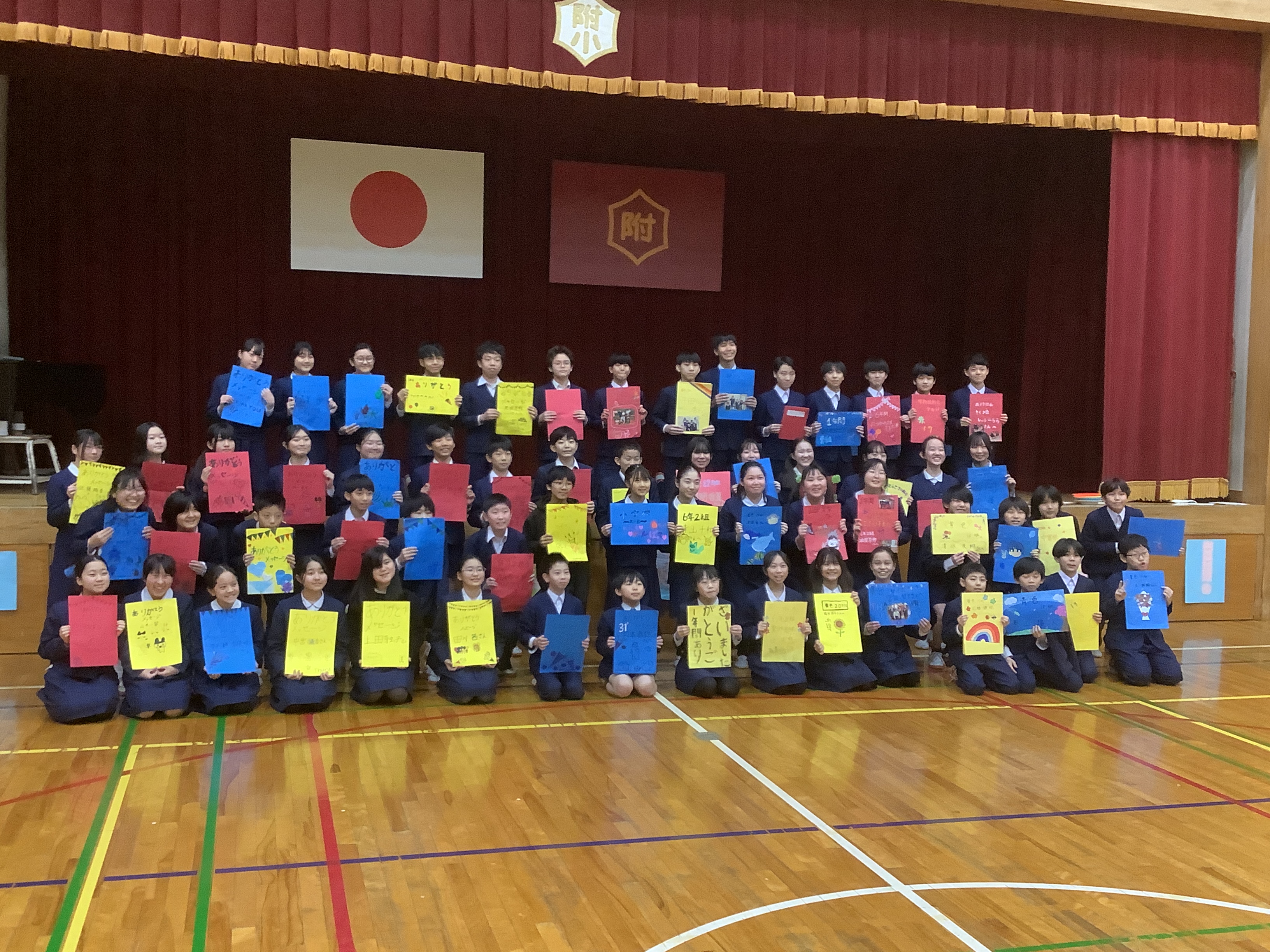 メッセージカードをもって6年生がそろって記念撮影