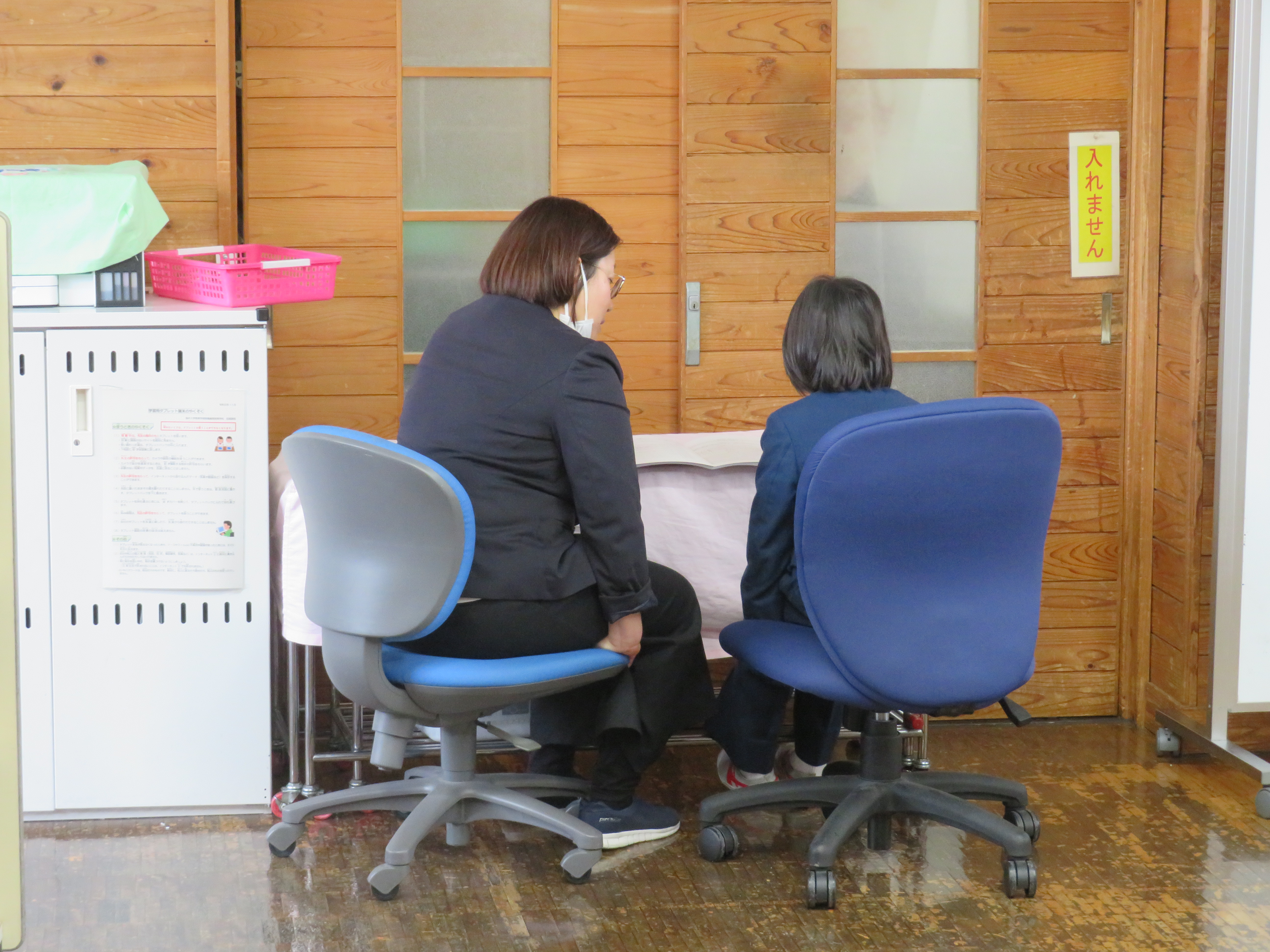 通知表を見ながら今年度の頑張りについて先生と一緒に振り返ります