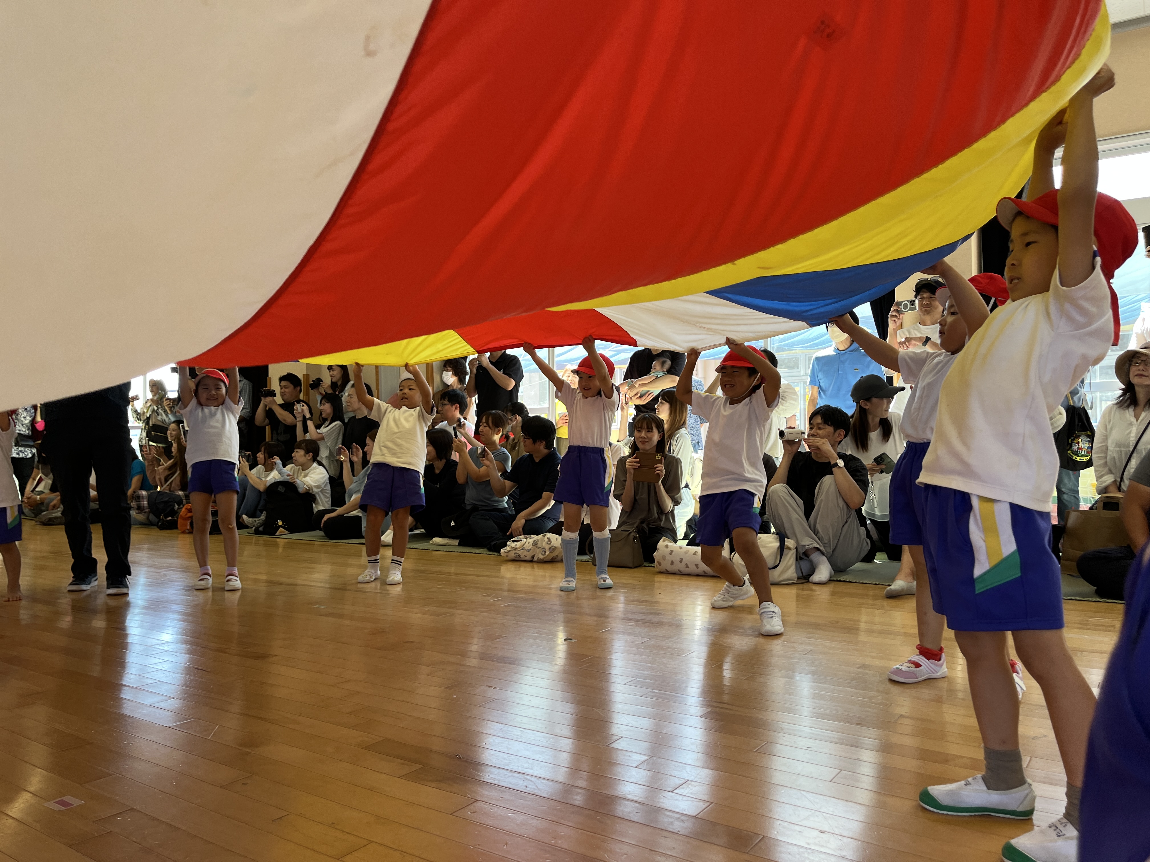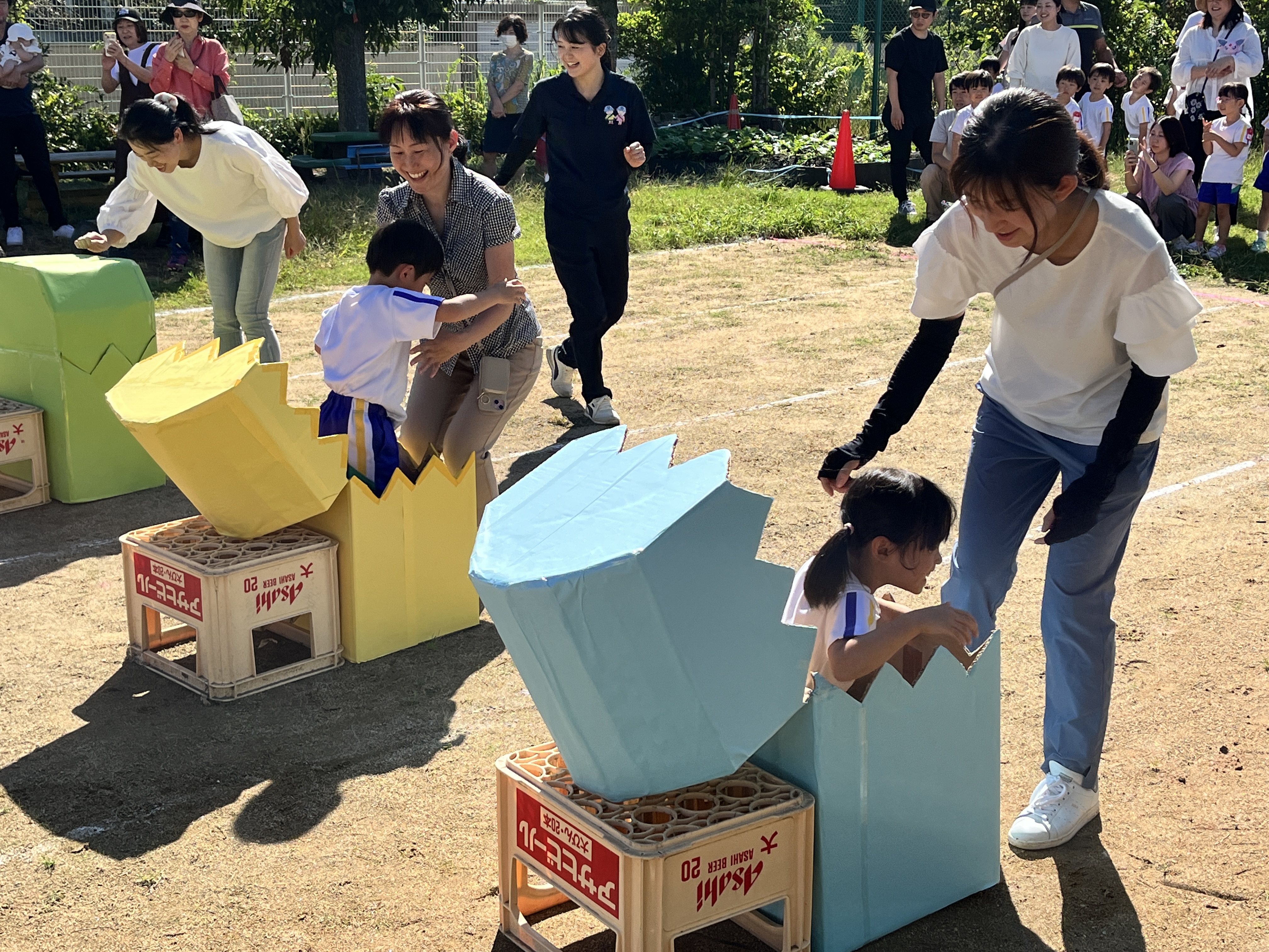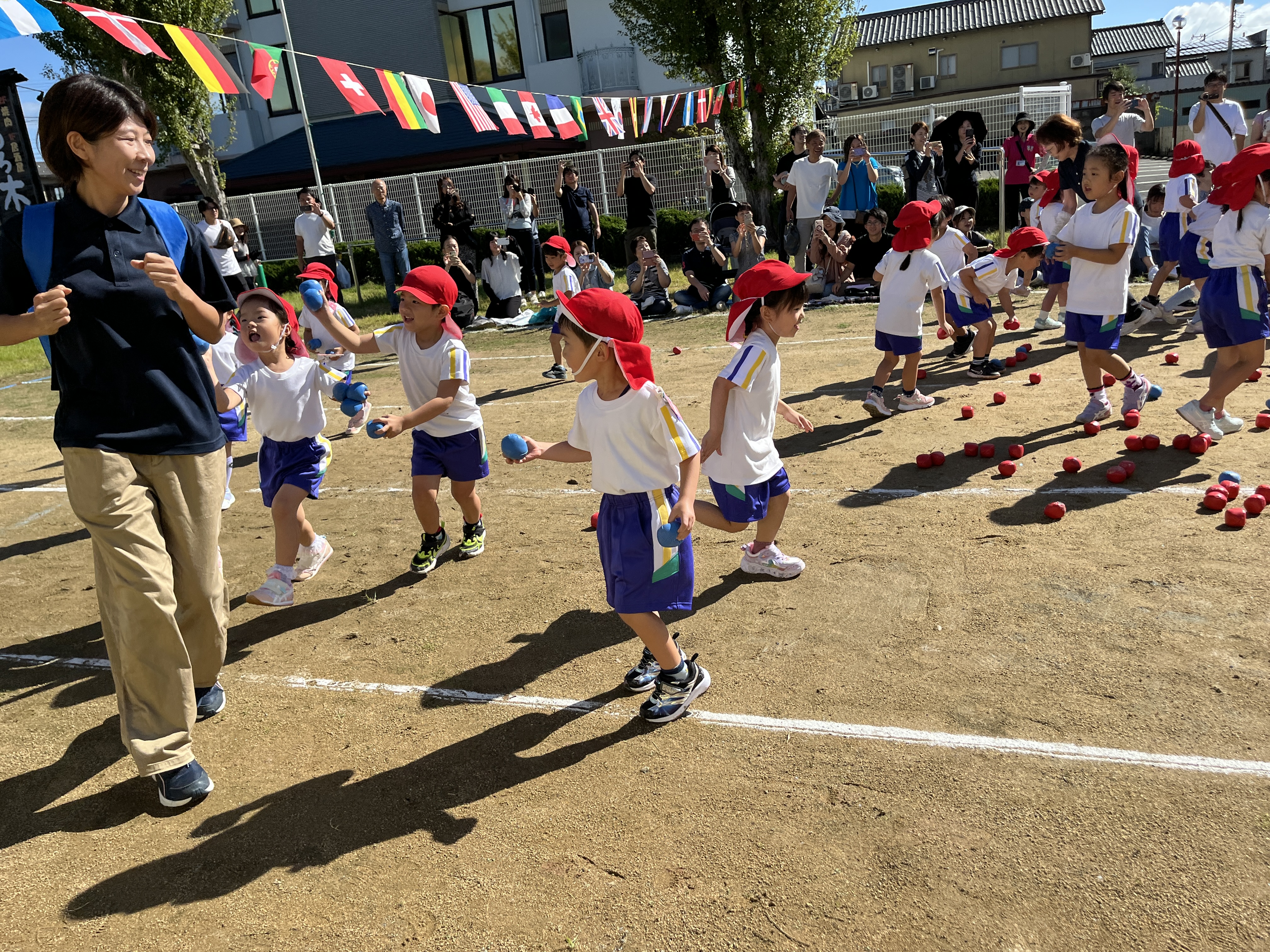 保護者の方にかごを担いでもらって、玉入れをしたり。