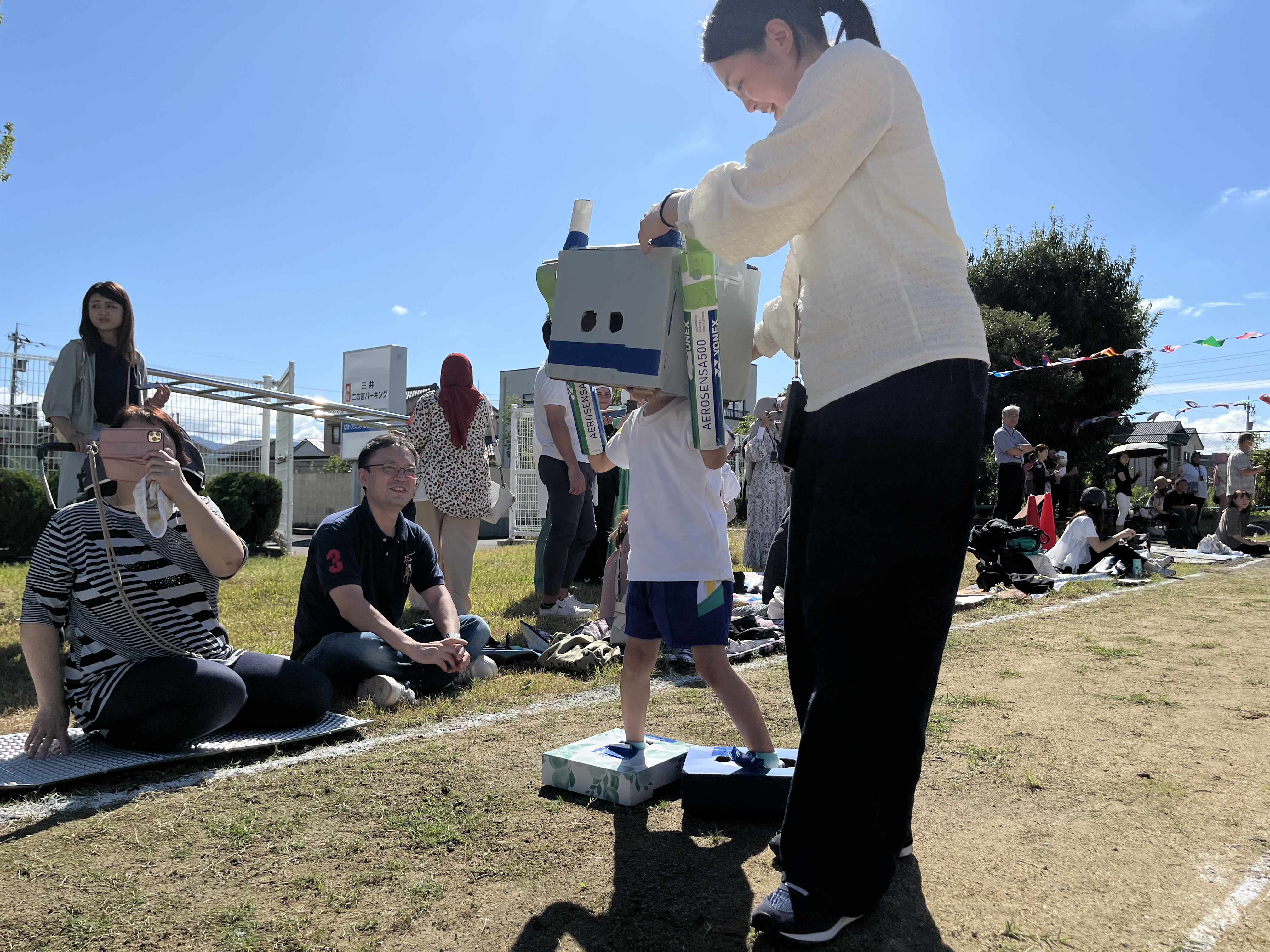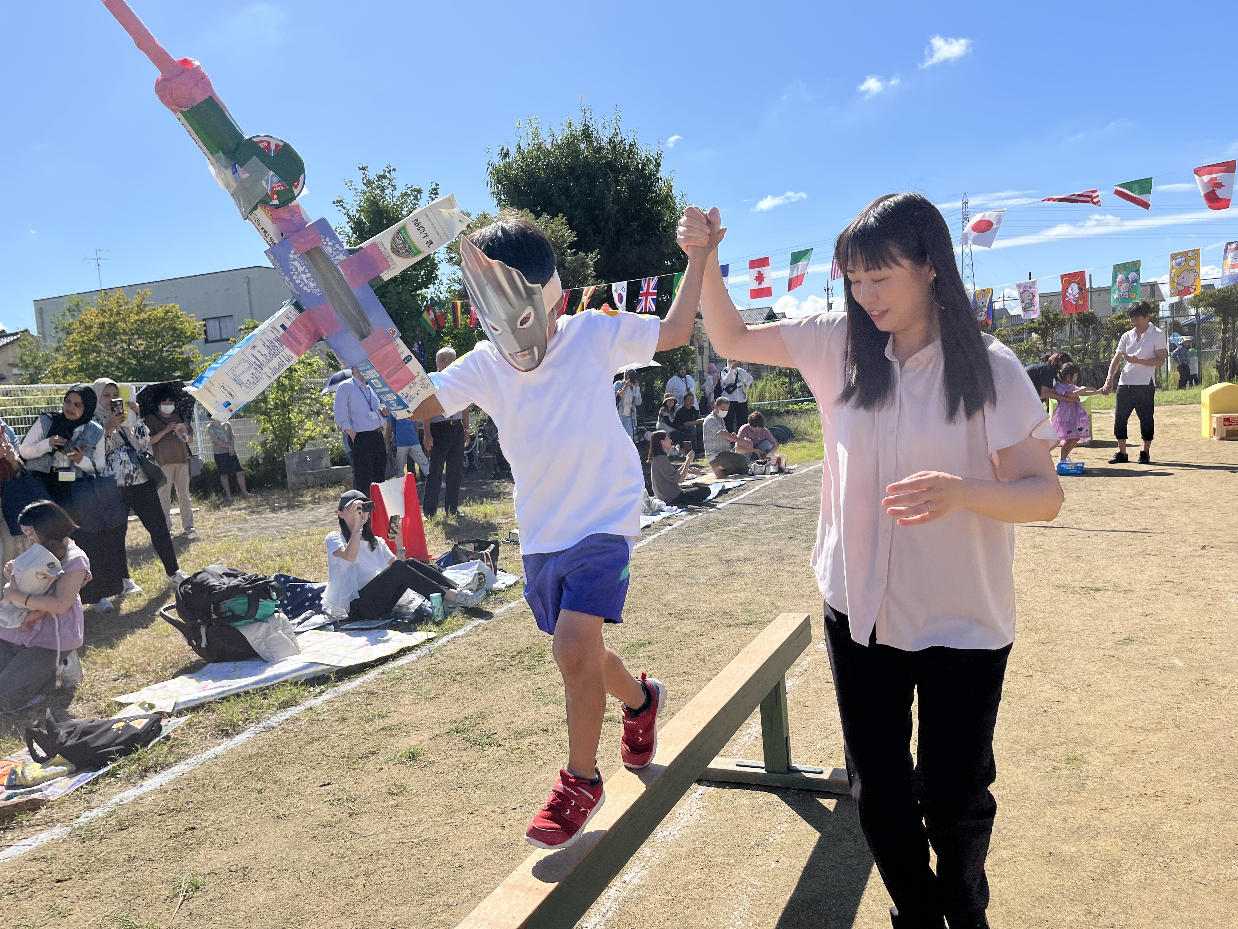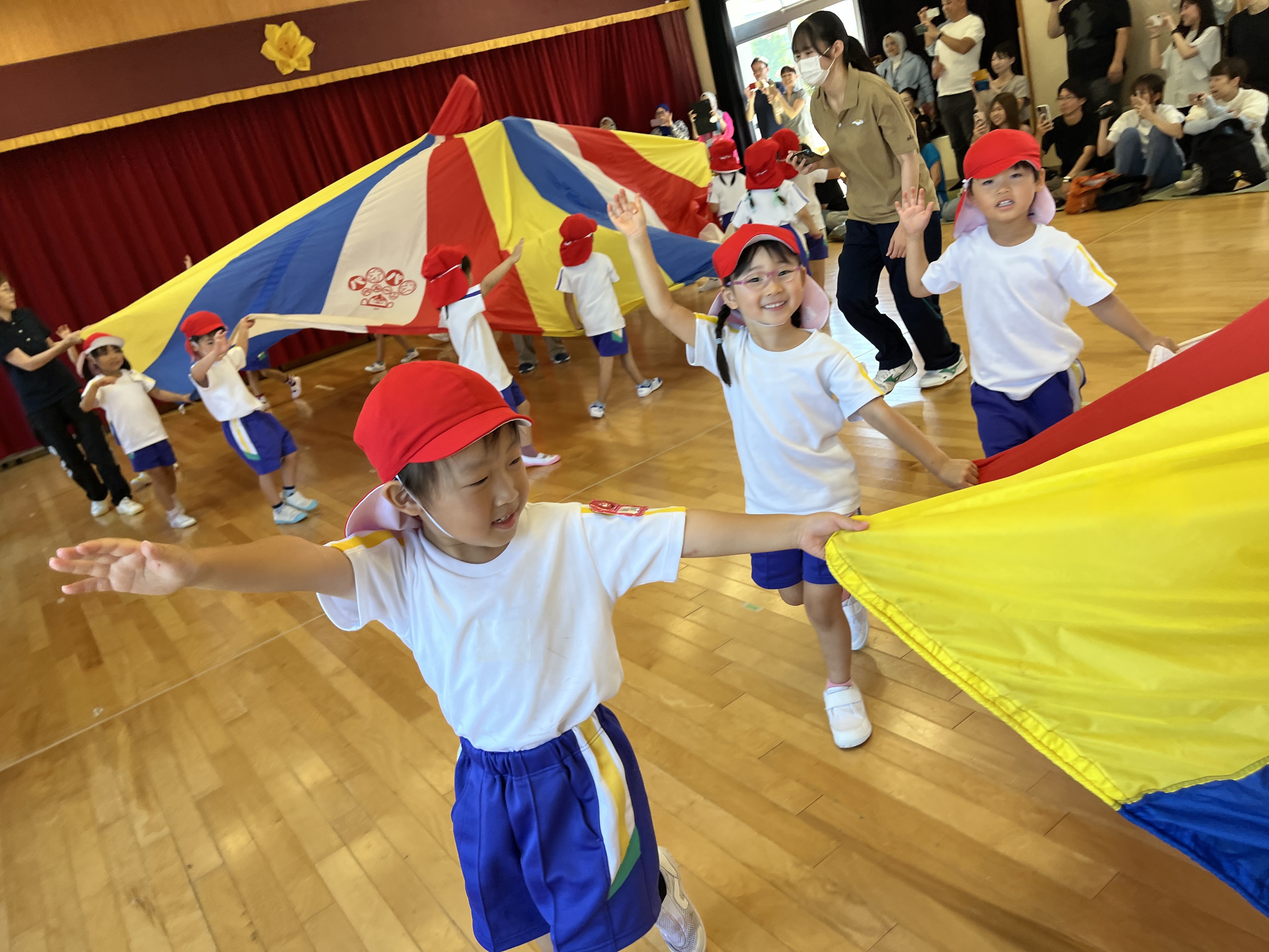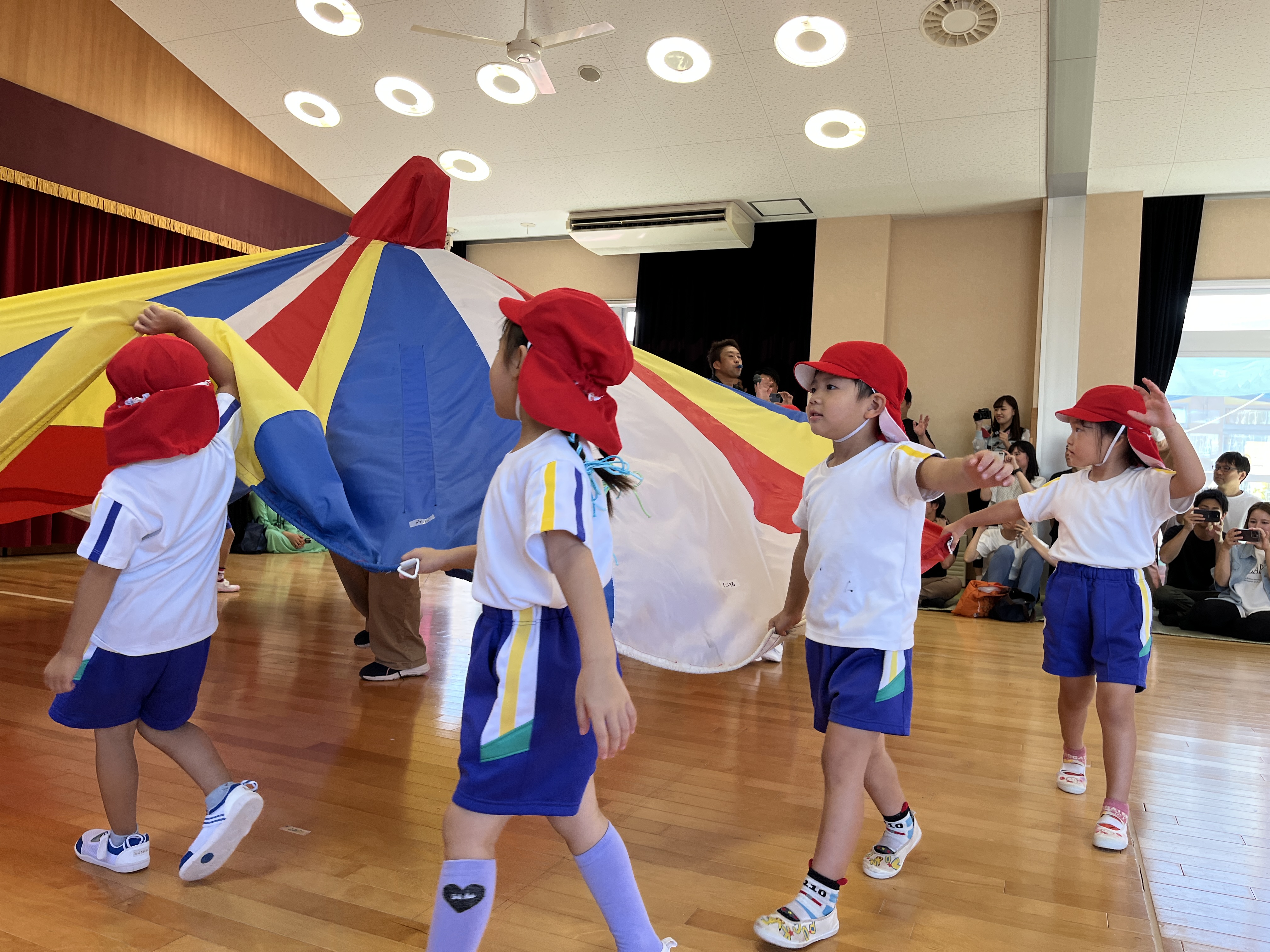 保護者の方にかごを担いでもらって、玉入れをしたり。