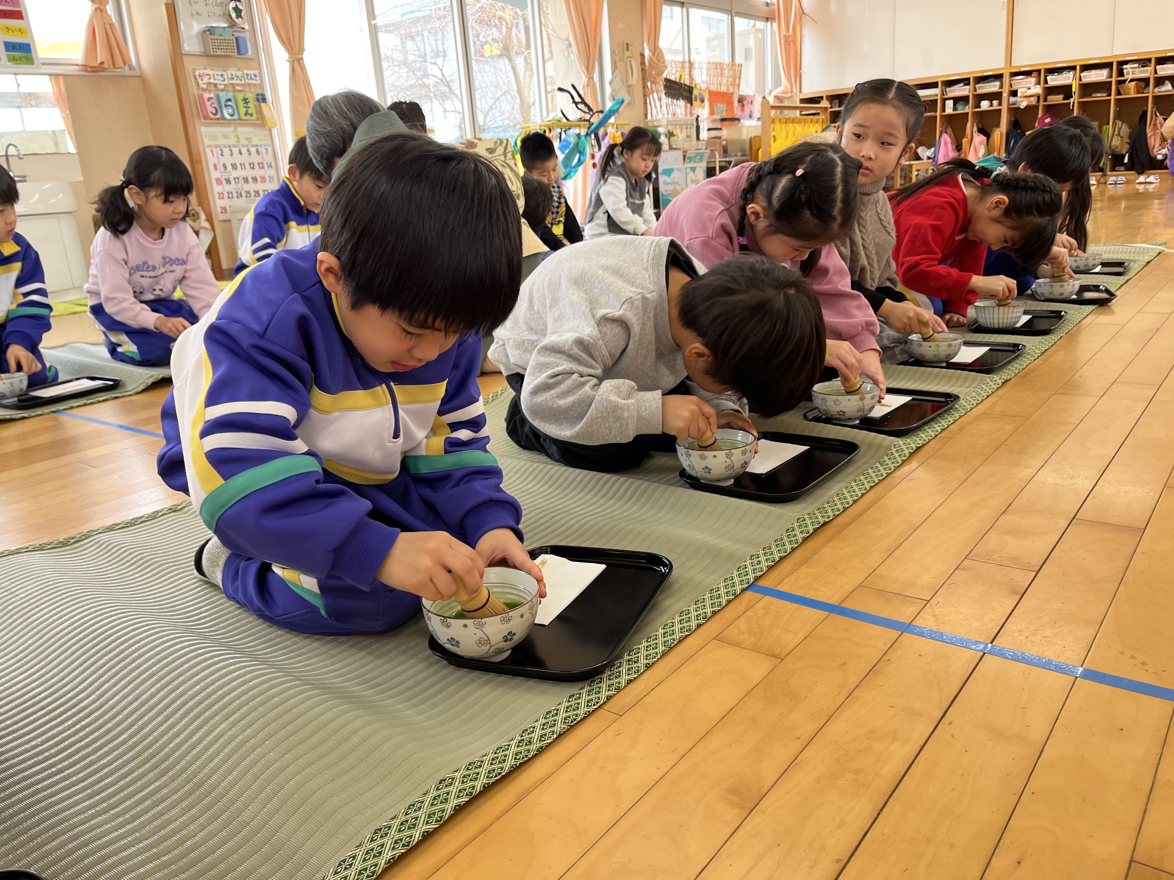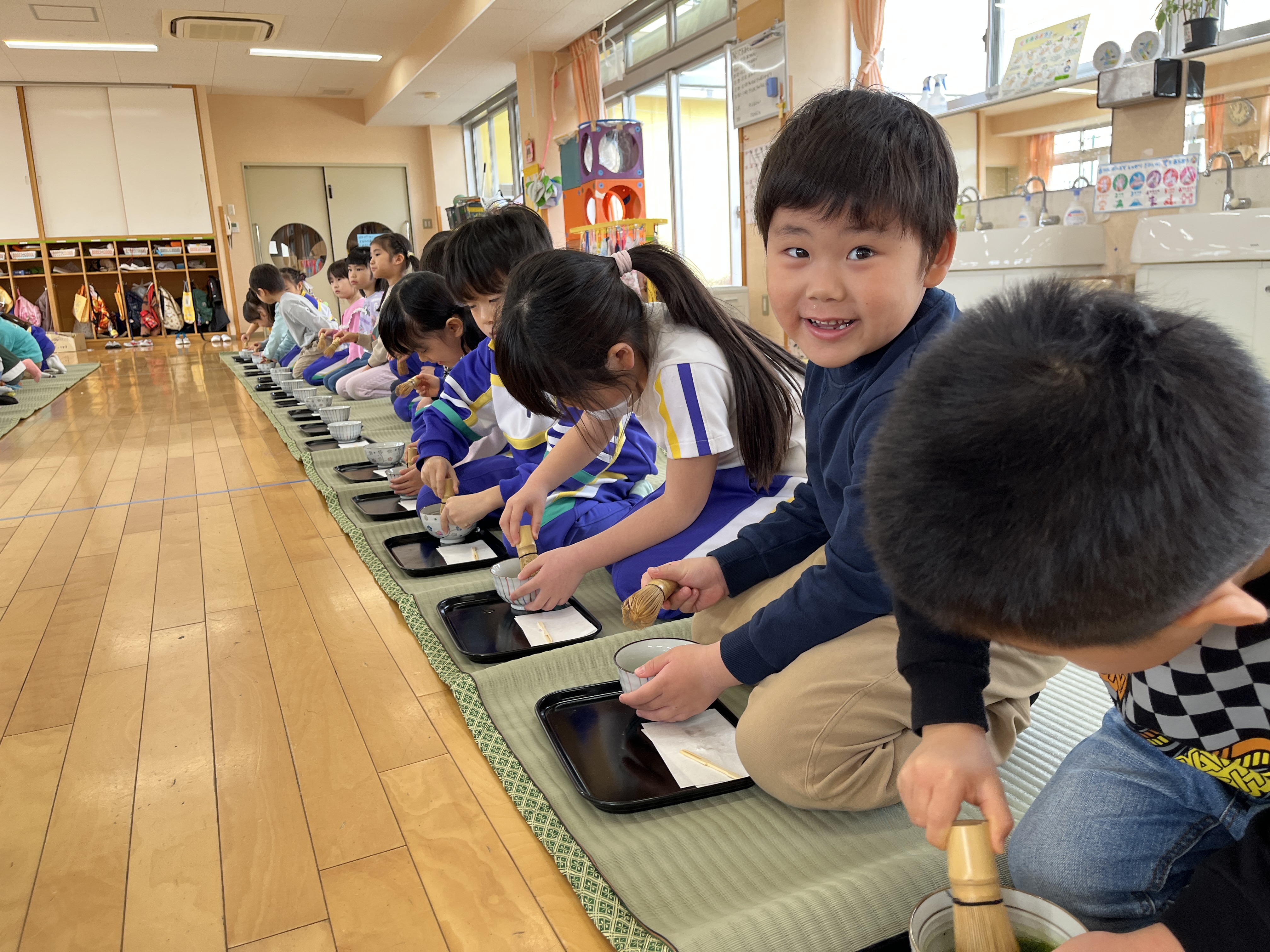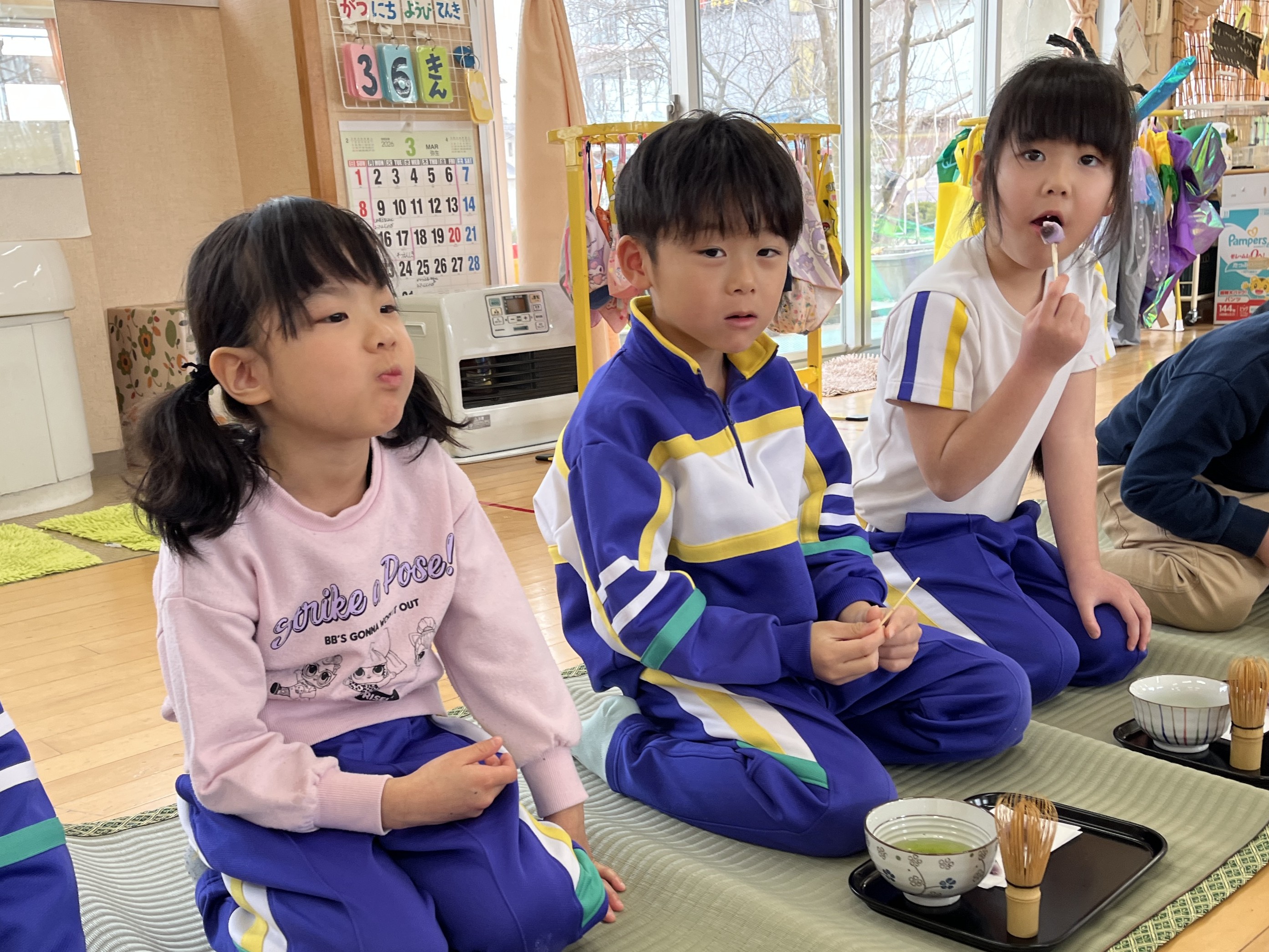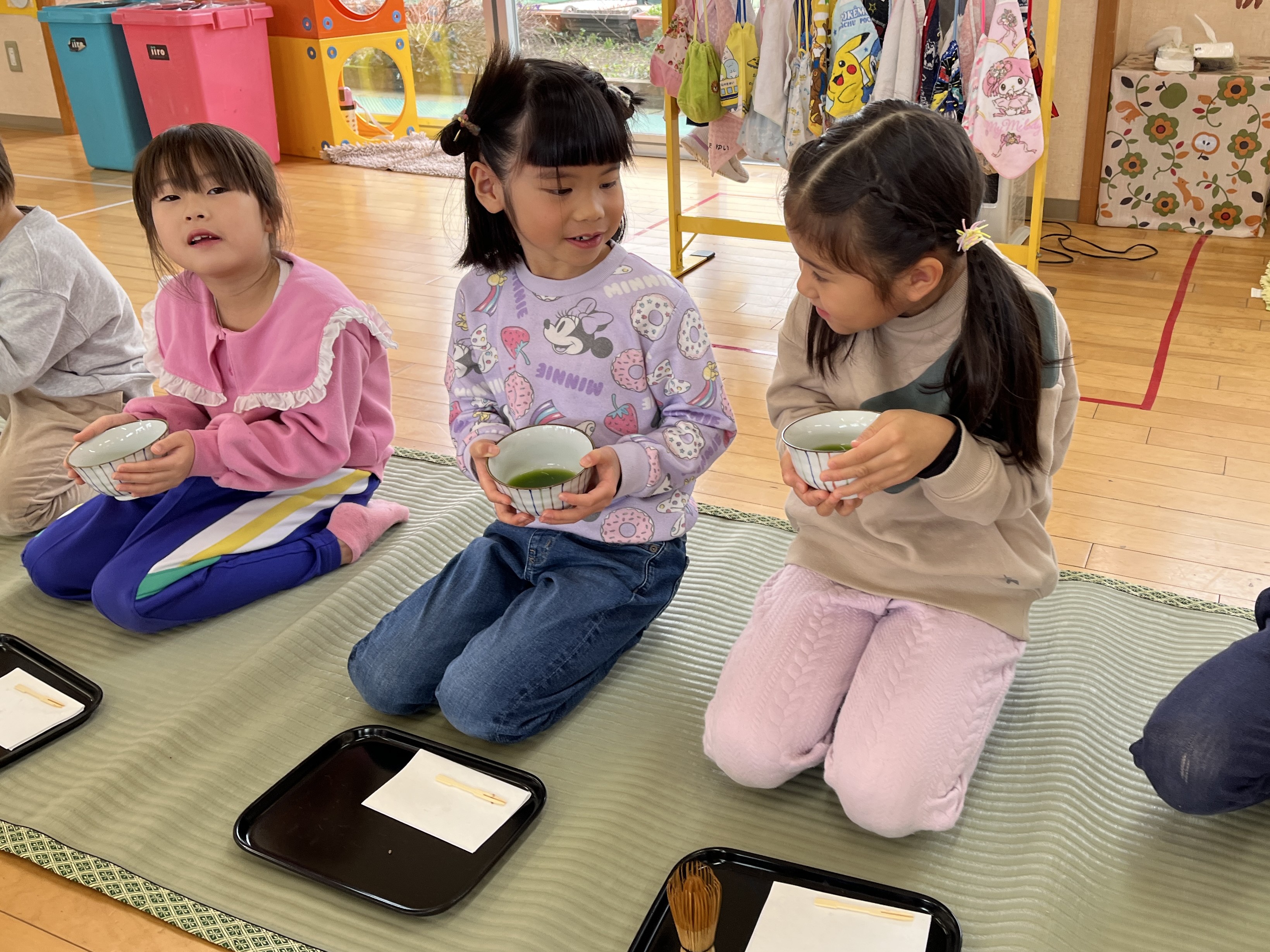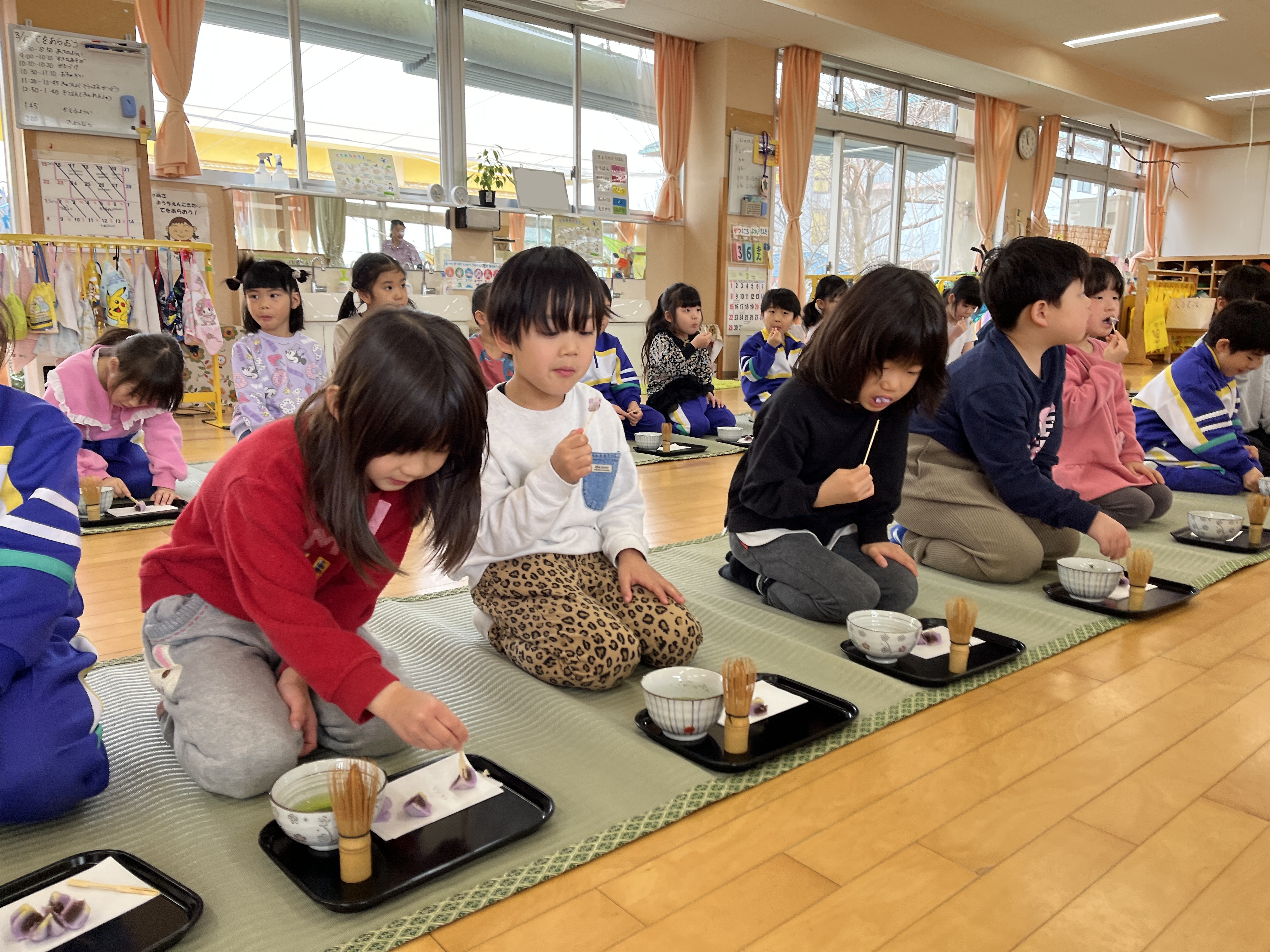 保育室にゴザを敷き、年長児全員でお茶会を楽しみました。