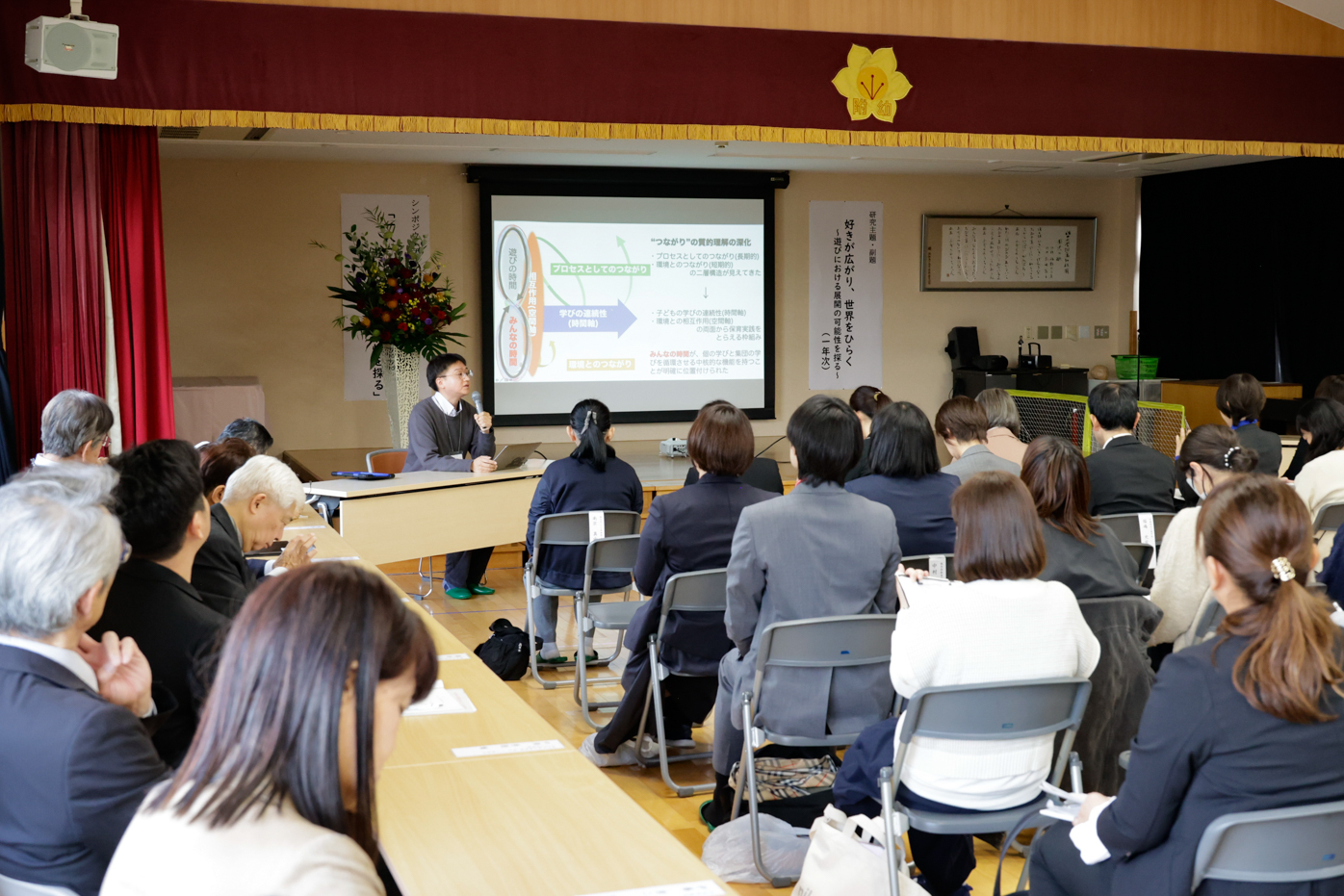 シンポジウムでは、白梅学園大学名誉教授 無藤隆先生 福井大学名誉教授 松木健一先生をシンポジストとして、福井大学連合教職大学院教授 岸野麻衣先生をコーディネーターとしてご登壇いただき、「一人一人の好きから遊びにおける展開の可能性を探る」についてお話しいただきました。